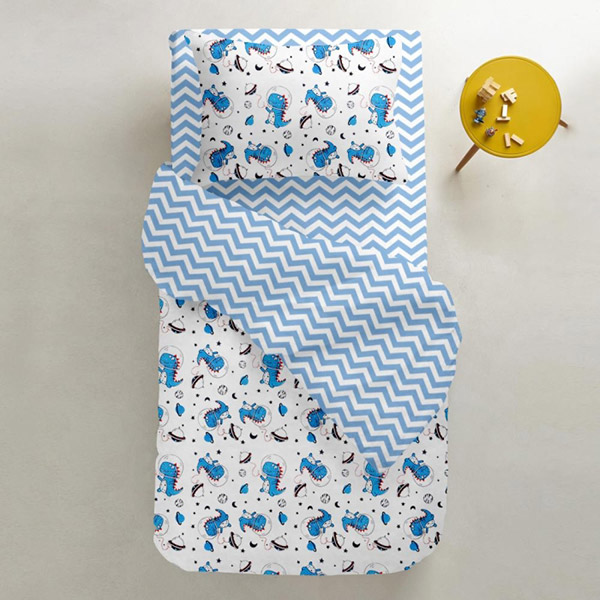 Детский пододеяльник из ранфорса. Одна сторона белого цвета с симпатичным рисунком с динозавриками-космонавтами, другая сторона с бело-голубыми зигзагами. Материал из 100% органического хлопка мягкий и приятный на ощупь, безопасный для чувствительной детской кожи, обеспечит ребенку комфортный сон и отдых.