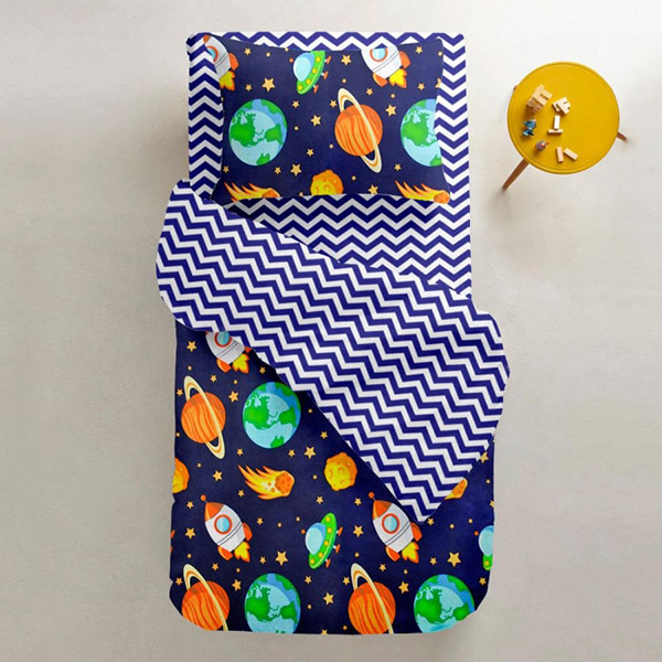 Детский пододеяльник из ранфорса. Одна сторона темно-синего цвета с симпатичным космическим принтом, другая сторона с бело-синими зигзагами. Материал из 100% органического хлопка мягкий и приятный на ощупь, безопасный для чувствительной детской кожи, обеспечит ребенку комфортный сон и отдых.