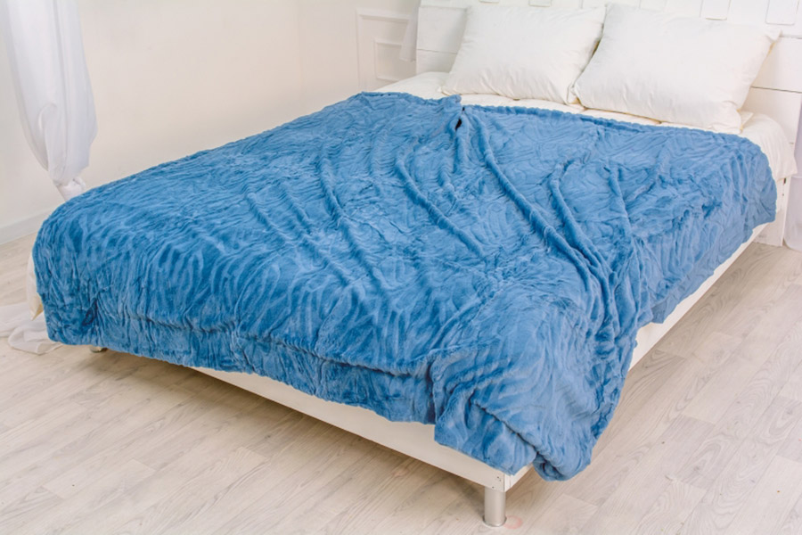 Мягкий красивый плед синего цвета с рельефным узором. Плед сделает комнату более уютной, замечательно дополнит интерьер, подарит тепло и комфорт во время отдыха.