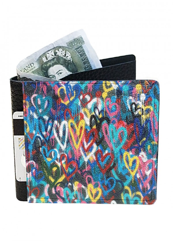 Кошелек из натуральной кожи Devays Maker. Кошелек имеет качественный красочный принт с разноцветными сердцами. Под рисунком скрывается небольшой карманчик для визиток или мелких купюр. Внутри одно большое отделение для денег и несколько карманчиков для банковских и других карточек. Кошелек фиксируется скрытыми магнитами.