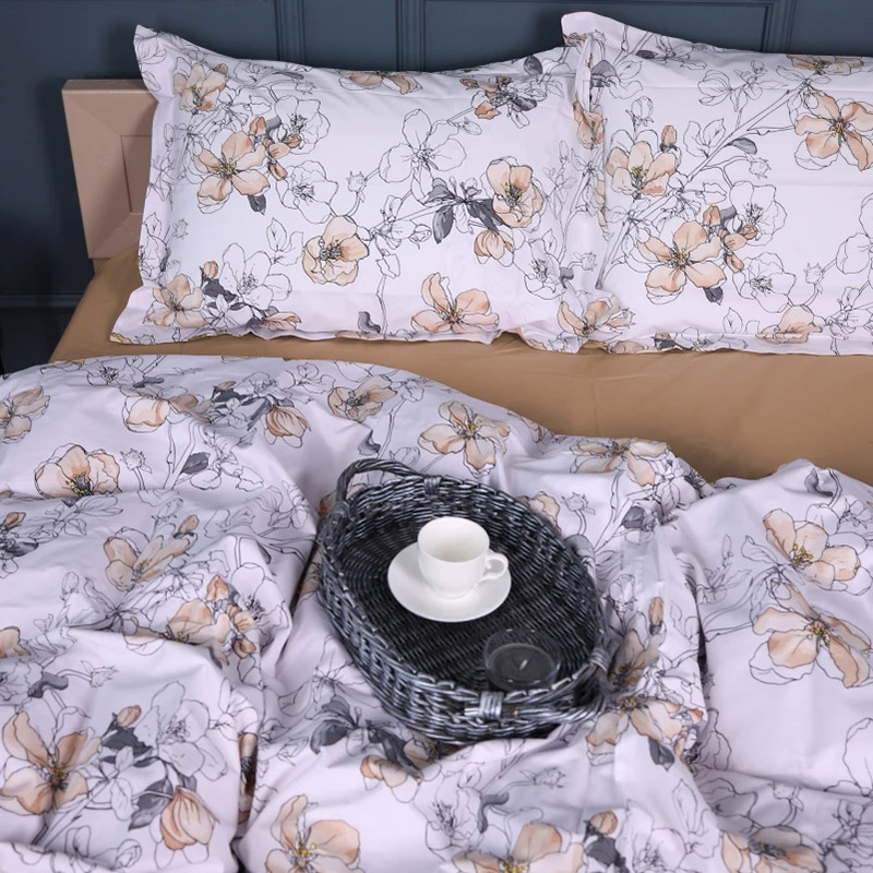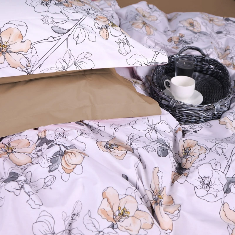 Поплиновый комплект в бело-бежевой гамме с красивым цветочным принтом. Постельное белье замечательно дополнит интерьер и сделает спальню более уютной. Качественная ткань из натурального хлопка приятная на ощупь, хорошо пропускает воздух, обеспечивает максимально комфортный сон.