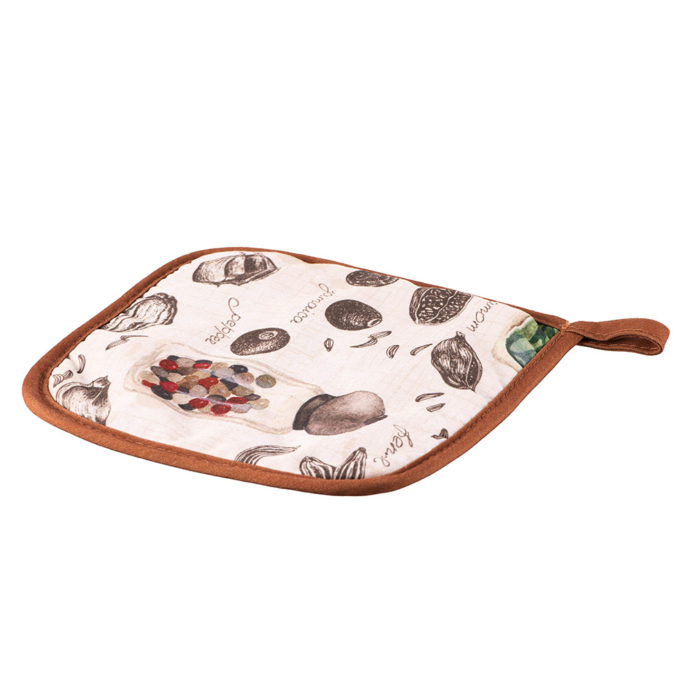 Квадратная прихватка с контрастной окантовкой и с удобной петелькой для подвешивания. Одна сторона прихватки - с симпатичным принтом со специями, другая - однотонная. Прихватка замечательно впишется в интерьер кухни. Качественная практичная ткань из полиэстера и хлопка прослужит вам долгое время, сохранив первоначальный цвет и вид.