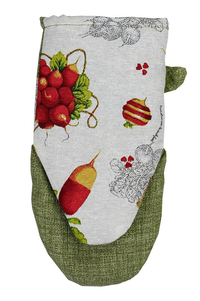 Прихватка-рукавица универсального размера с удобной петелькой для подвешивания. Симпатичный принт с редисочками привнесет в интерьер нотки природы и уюта, станет красивым акцентом на кухне. Рукавица надежно защитит руки от горячих поверхностей. Рукавица выполнена из качественного материала. Ткань из хлопка и полиэстера практичная, прочная и износостойкая, надолго сохранит привлекательный внешний вид.