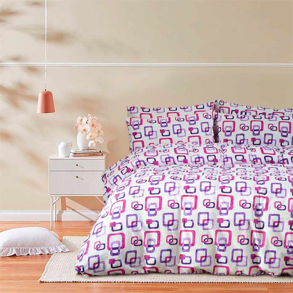 Постельное белье с геометрическим рисунком лиловых оттенков смотрится очень стильно и красиво. Натуральная хлопковая ткань обеспечит вам уют и комфорт во время сна.