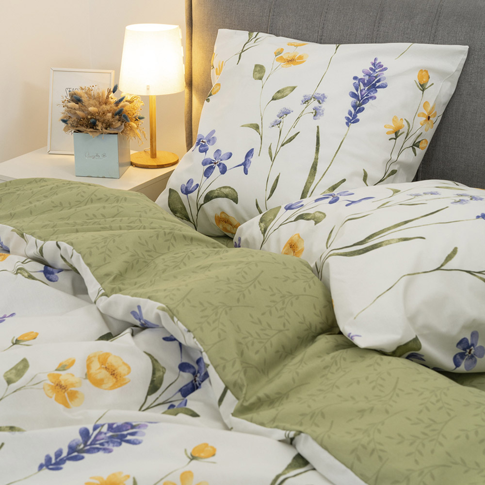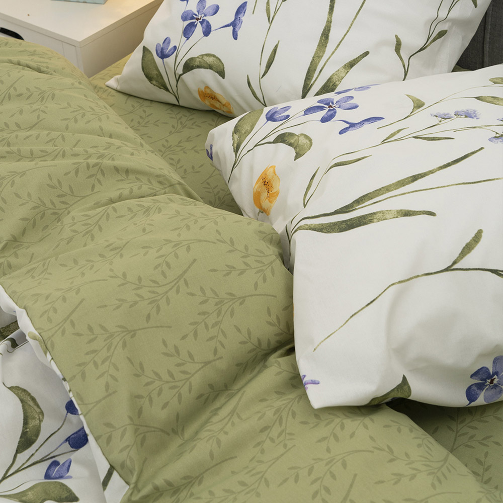Постельное белье из ранфорса. Комплект в бело-зеленом цвете с красивым цветочным принтом, сделает спальню более уютной. Качественная ткань из натурального хлопка обеспечит комфортный и приятный сон, прослужит долгое время, сохранив привлекательный внешний вид.