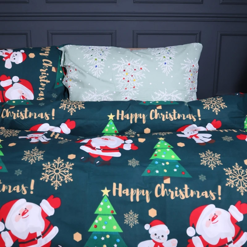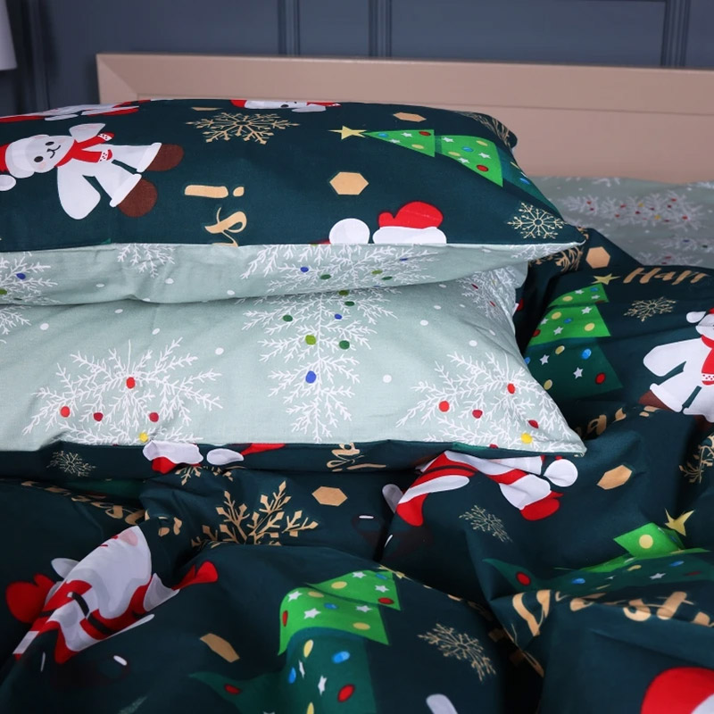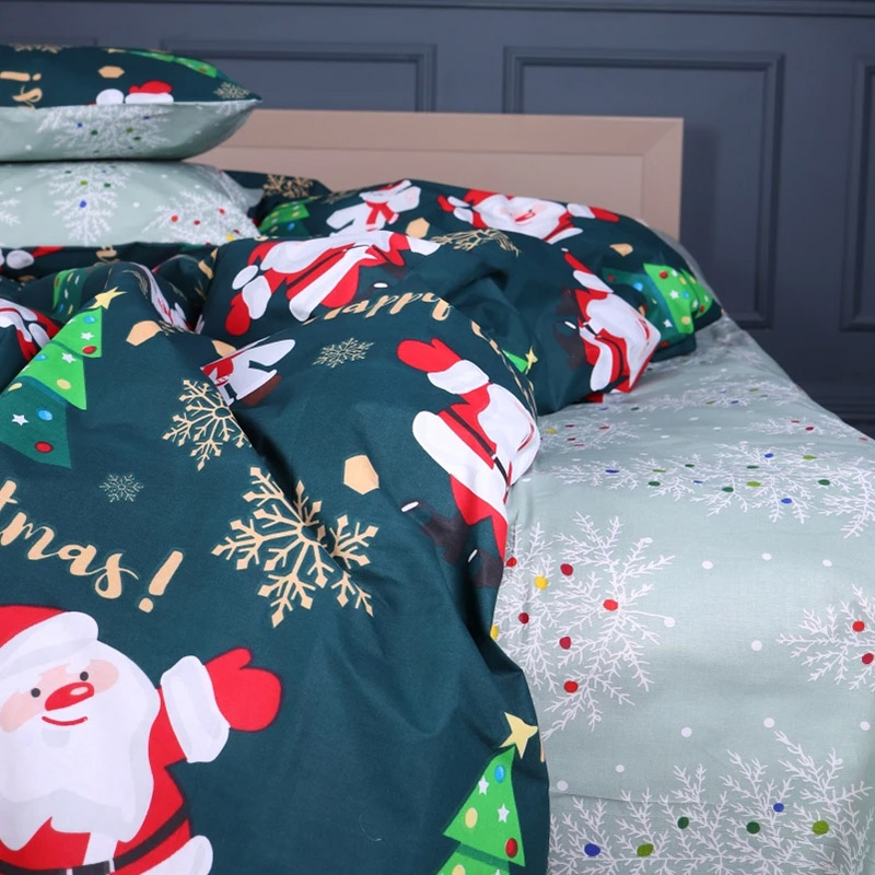 Качественное постельное белье в зеленой гамме. Симпатичный зимний принт с Санта Клаусами, елками и снежинками подарит праздничное настроение, сделает спальню уютной и неповторимой. Натуральный хлопковый материал приятный на ощупь, обеспечит максимально комфортный и здоровый сон. Комплект поставляется в фирменной коробке, замечательно подойдет в качестве подарка для родных и близких.