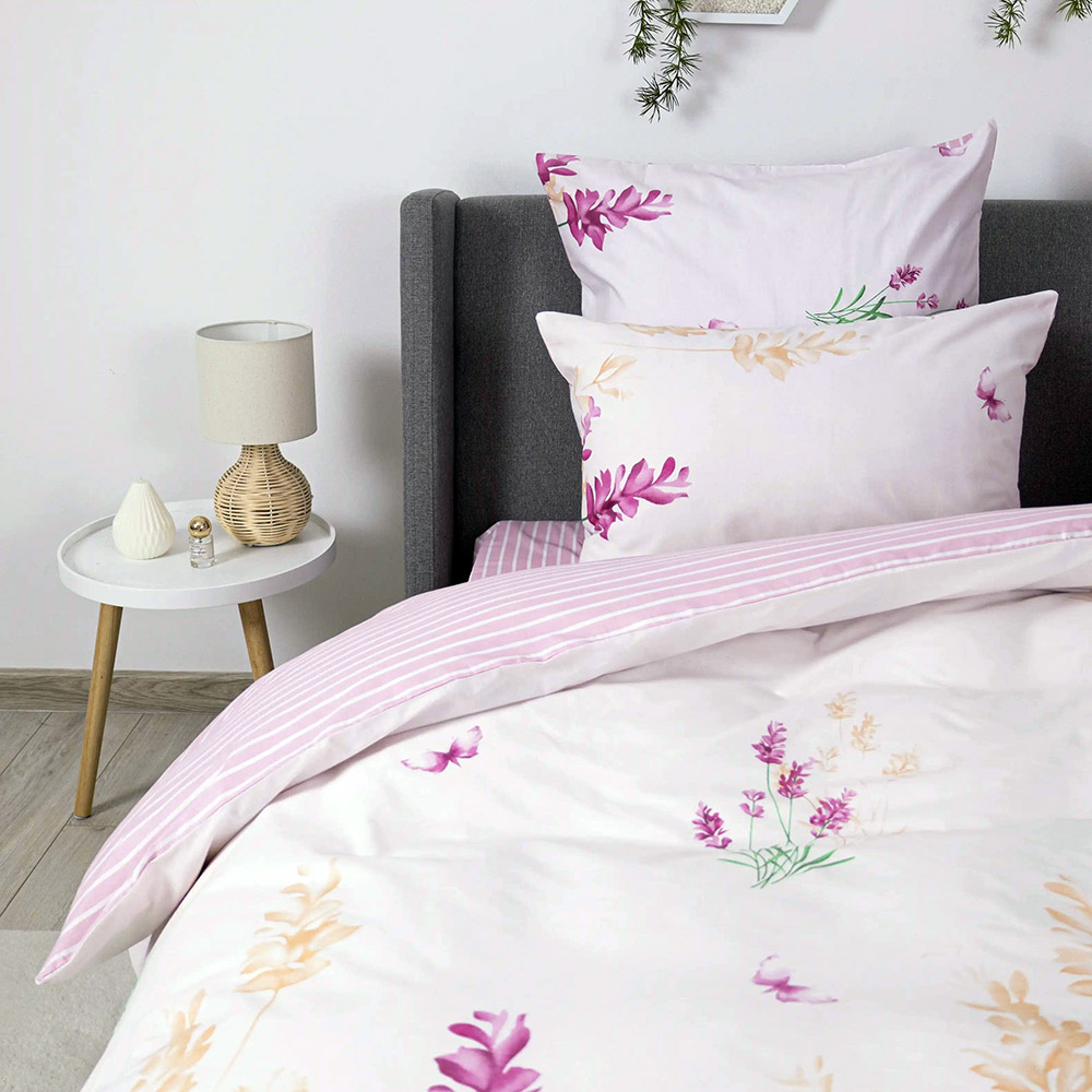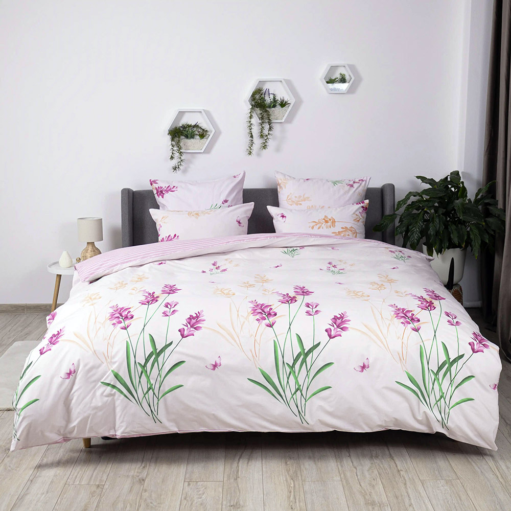 Натуральное хлопковое постельное белье подарит вам уют и комфорт во время сна. Элегантный цветочный принт замечательно сочетается с симпатичными полосками, создает в комнате атмосферу весны и уюта.