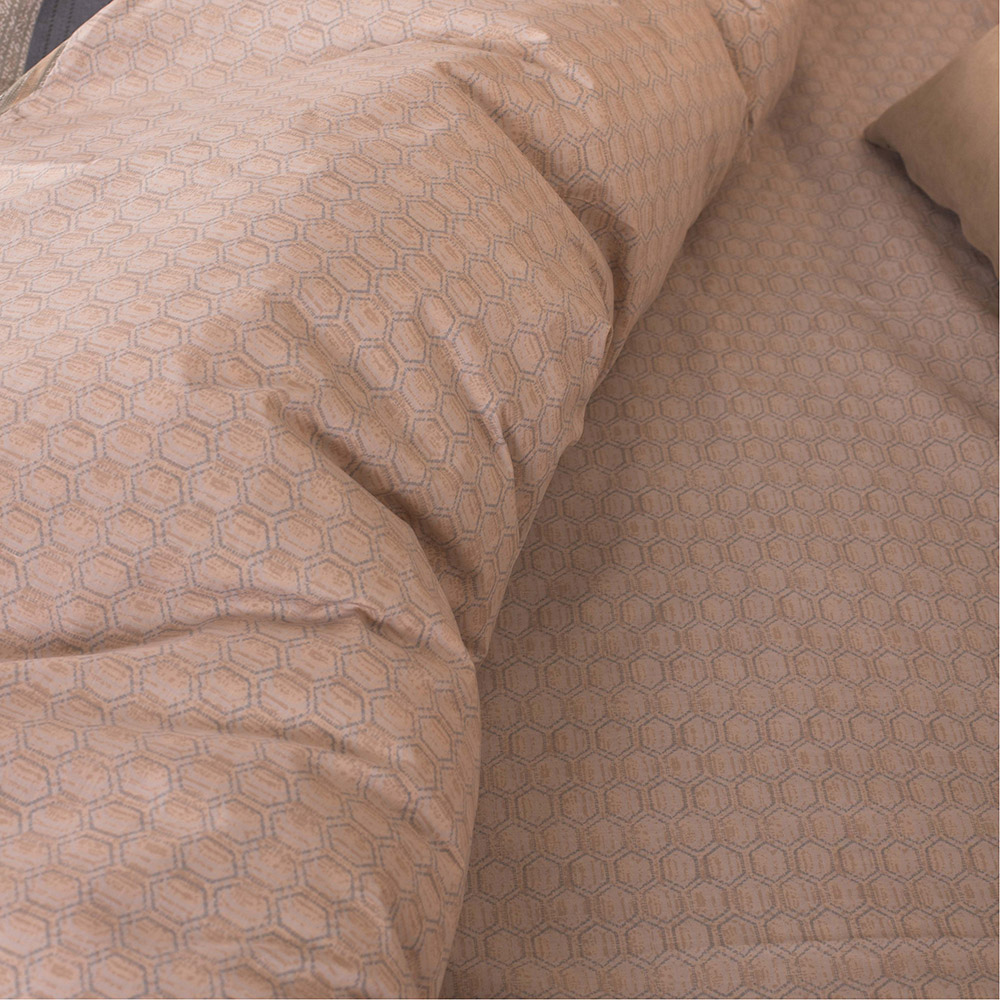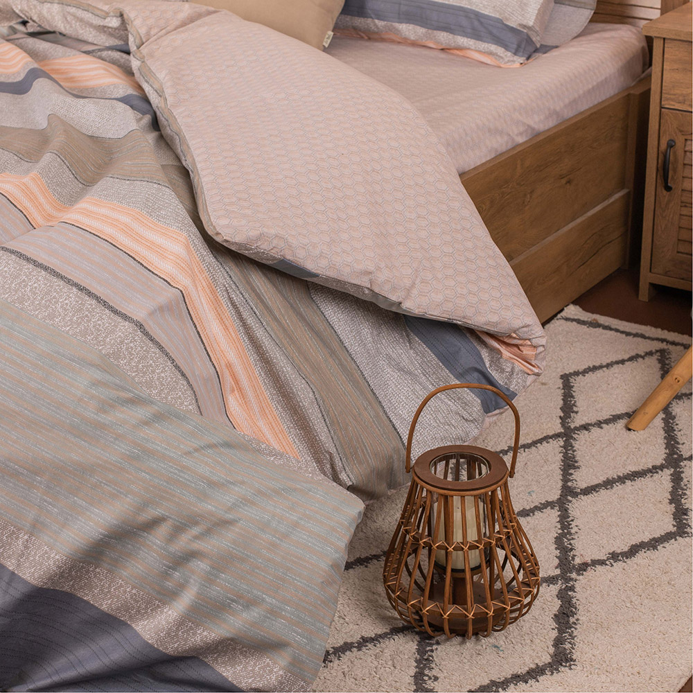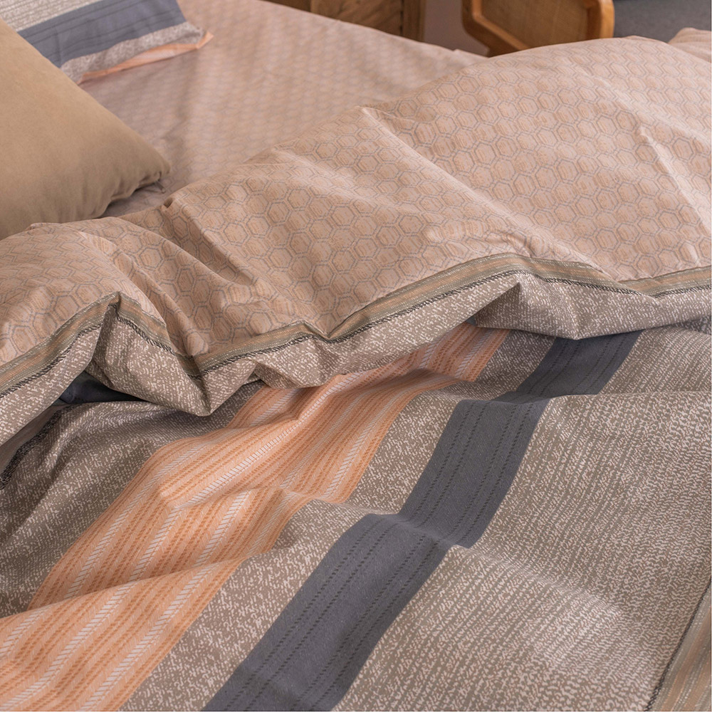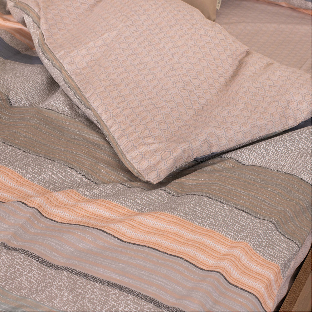 Постельное белье спокойных бежевых оттенков с полосками и геометрическим узором. Комплект замечательно дополнит современный интерьер, станет стильным акцентом в спальне. Натуральная хлопковая ткань обеспечит комфортный и приятный сон.