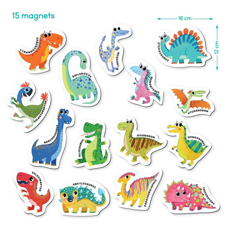 В комплекте содержится 15 магнитов, каждый из которых представляет собой разные динозавры. Каждый магнит сопровождается названием динозавра, что способствует развитию речевых навыков детей и расширяет их знания об этих увлекательных существах. Магниты легко прикрепляются к магнитной поверхности, что делает обучение интересным и интерактивным.