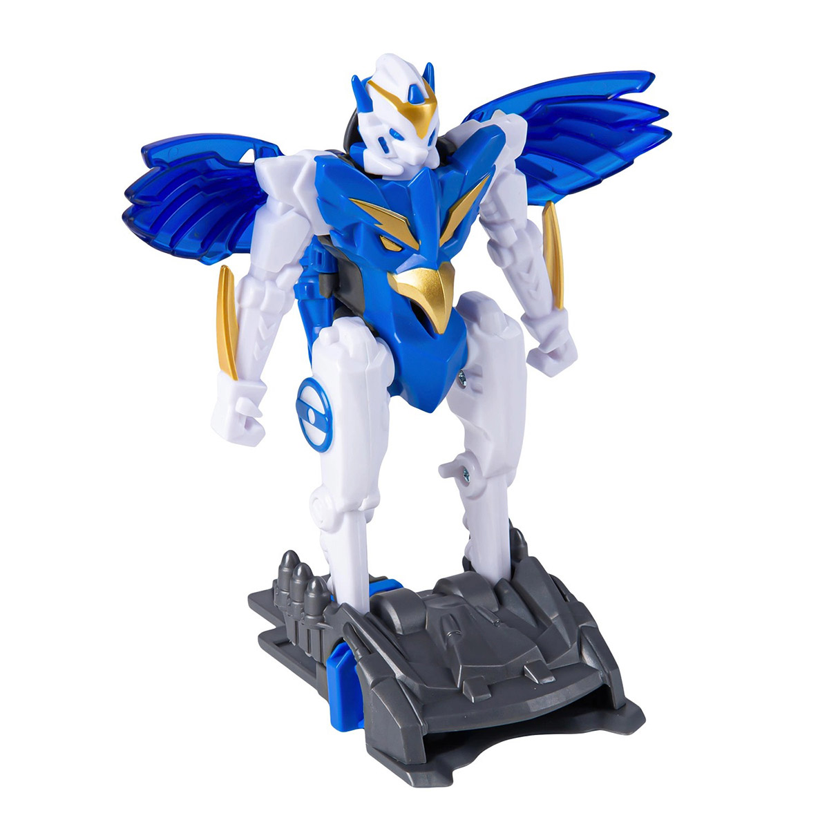 В комплект входит: машинка-трансформер, запускатель-бластер, диск, лист с наклейками