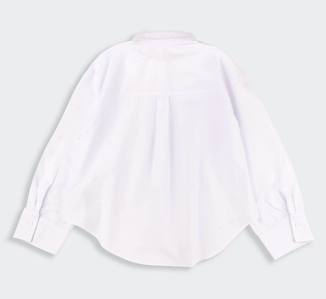 Однотонная классическая рубашка унисекс белого цвета, спереди застегивается на пуговицы. Рукава длинные, на манжетах. Воротник отложной.