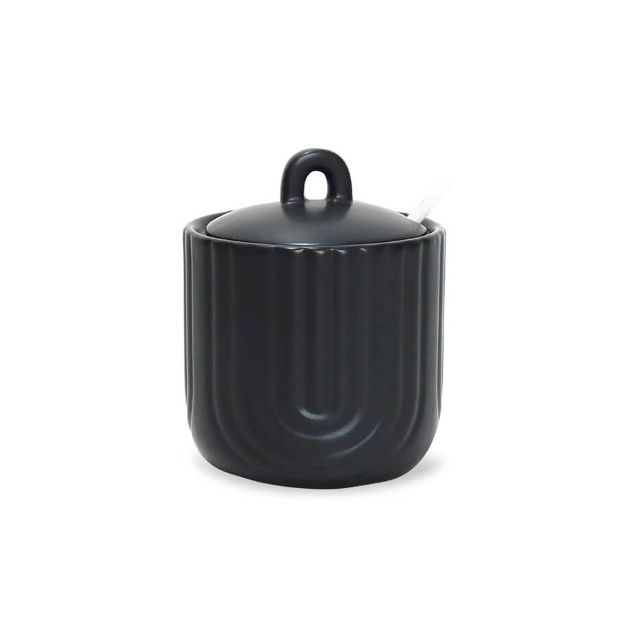 Замечательная сахарница объёмом 0.3 л. Сахарница черного цвета с красивыми рельефными линиями, дополнена крышкой и ложечкой. Сахарница выполнена из качественной керамики, сочетает в себе функциональность, стиль и прочность, создавая неповторимую атмосферу уюта на кухне.