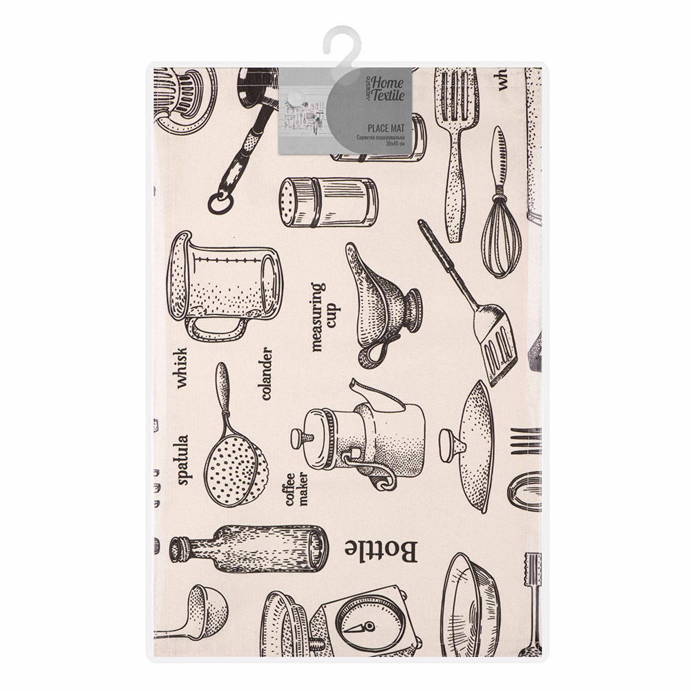 Прямоугольная сервировочная салфетка молочного цвета с симпатичным принтом с кухонными аксессуарами. Салфетка замечательно дополнтт сервировку стола, сделает интерьер более уютным. Салфетка выполнена из качественной практичной ткани на основе полиэстера с добавлением хлопка. Материал прослужит вам долгое время, сохранив первоначальный цвет и вид.