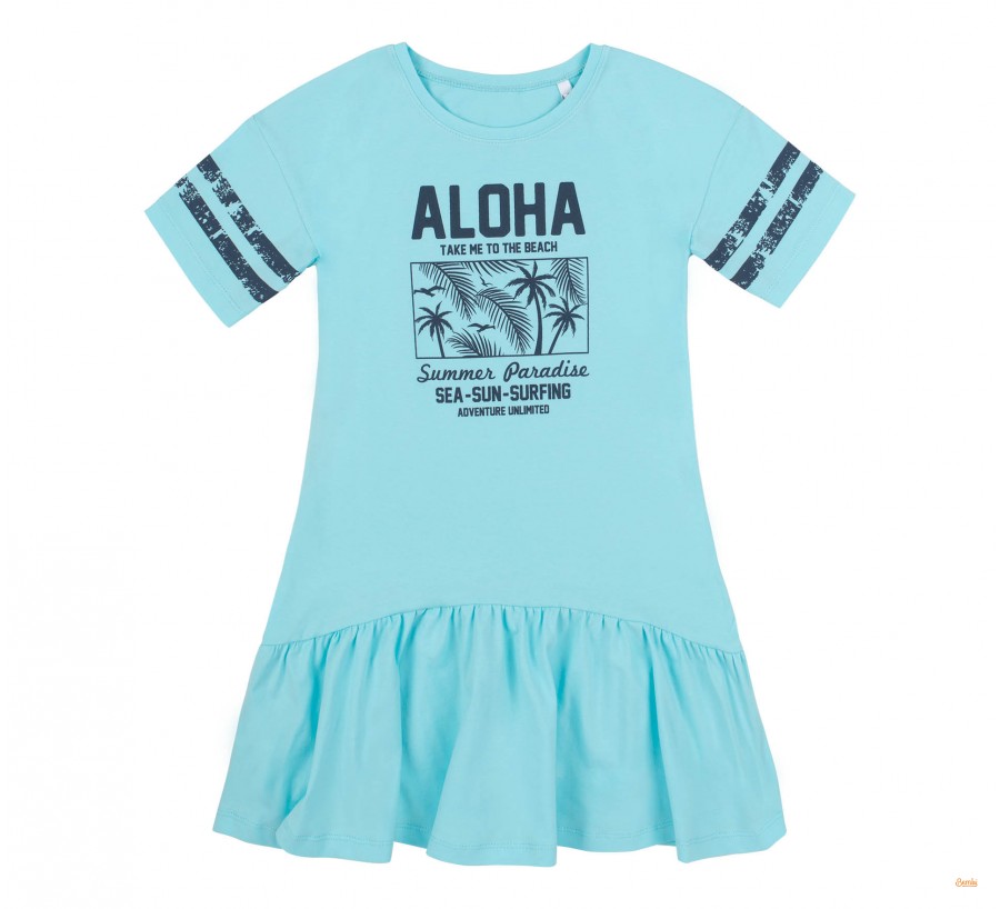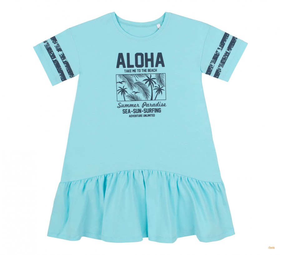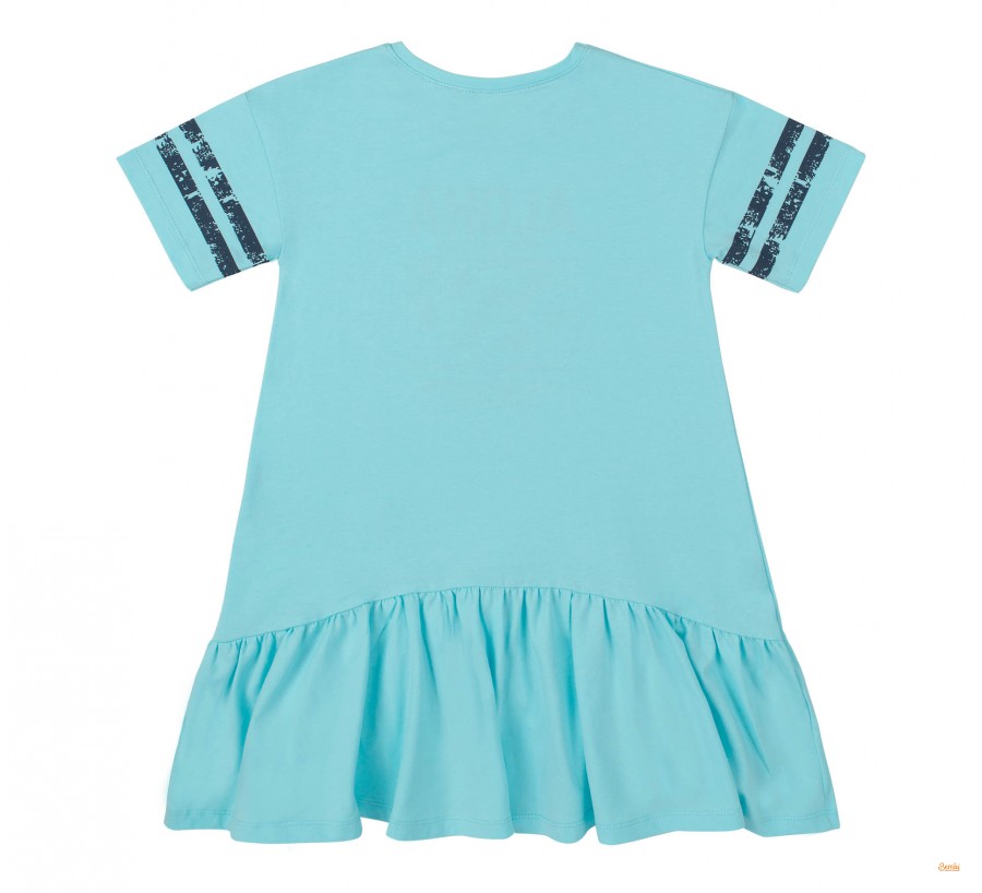 Платье для девочки Bembi ПЛ352 супрем мятный. Платье с коротким рукавом для девочки. Крой свободный, длина средняя. По низу широкая рюша. Ткань эластичная, спереди принт.