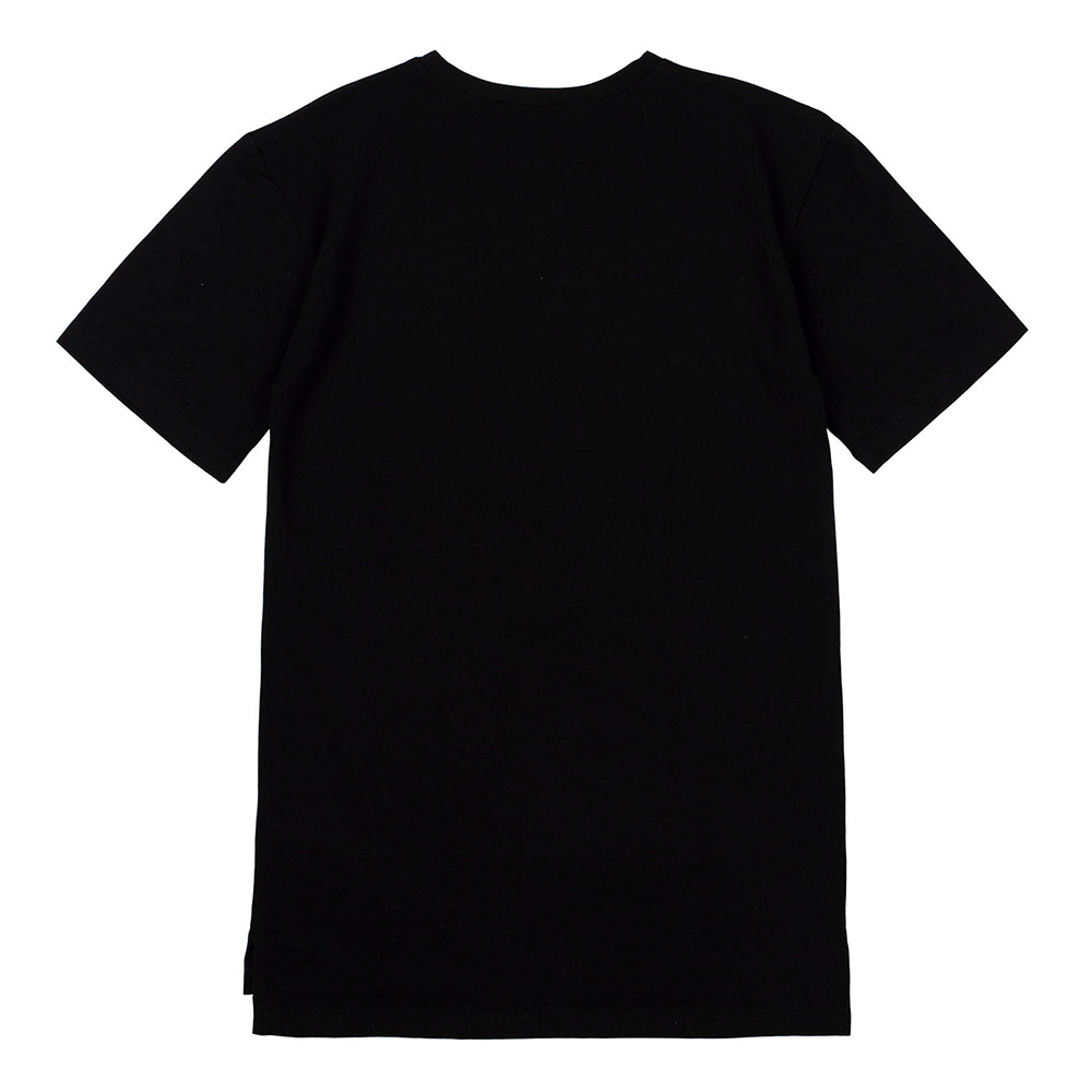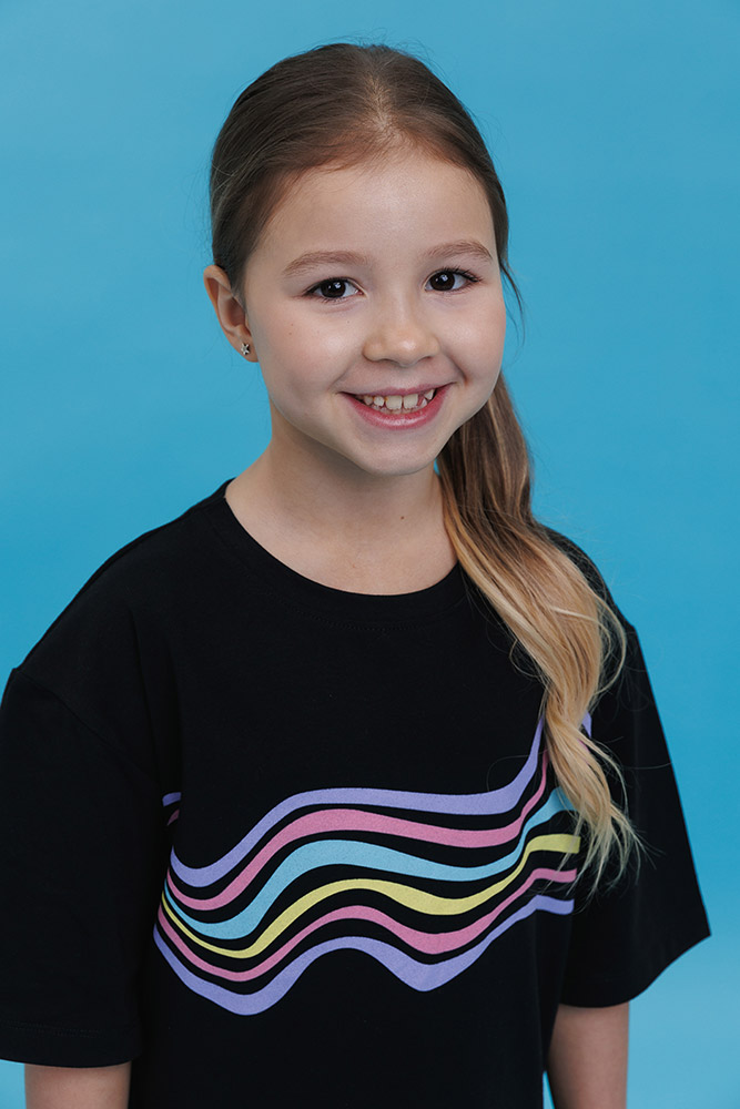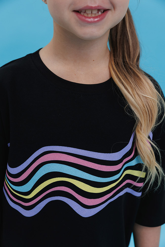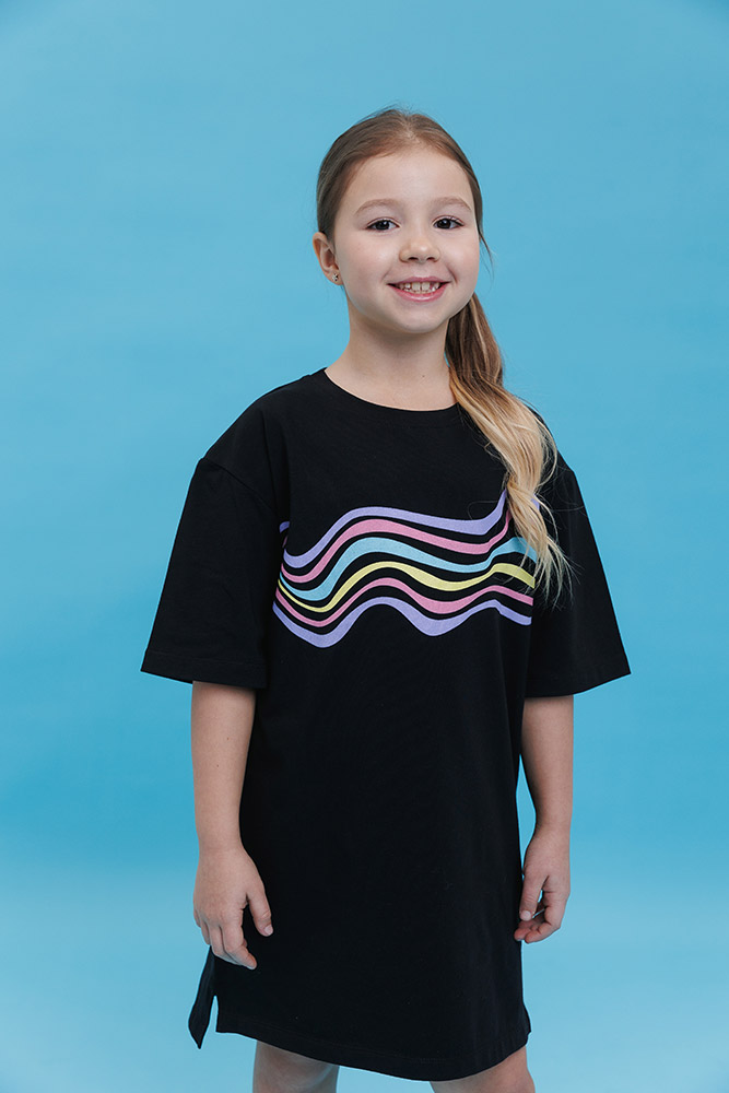 Платье-футболка черного цвета, спереди симпатичный принт (разноцветные волнистые линии). Модель свободного кроя, с короткими рукавами и круглой горловиной. Платье выполнено из ткани супрем. Хлопковый материал легкий, мягкий и приятный на ощупь, хорошо пропускает воздух, идеально подходит для детской кожи.
