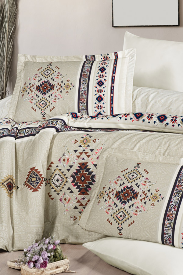 Превосходный сатиновый комплект кремового цвета с красивым орнаментом в этно-стиле. Постельное белье замечательно дополнит интерьер, сделает спальню более уютной. Натуральная хлопковая ткань с нежной шелковистой фактурой позволит вам хорошо выспаться и отдохнуть.