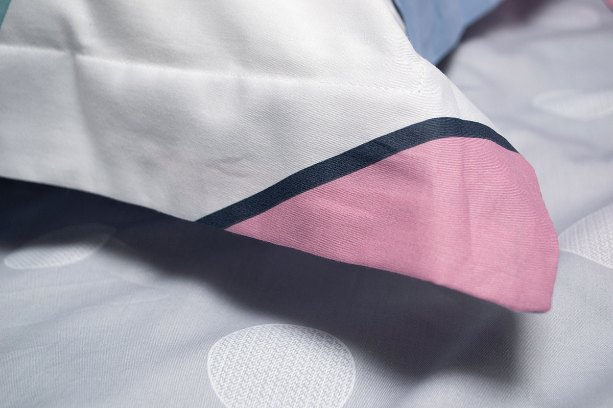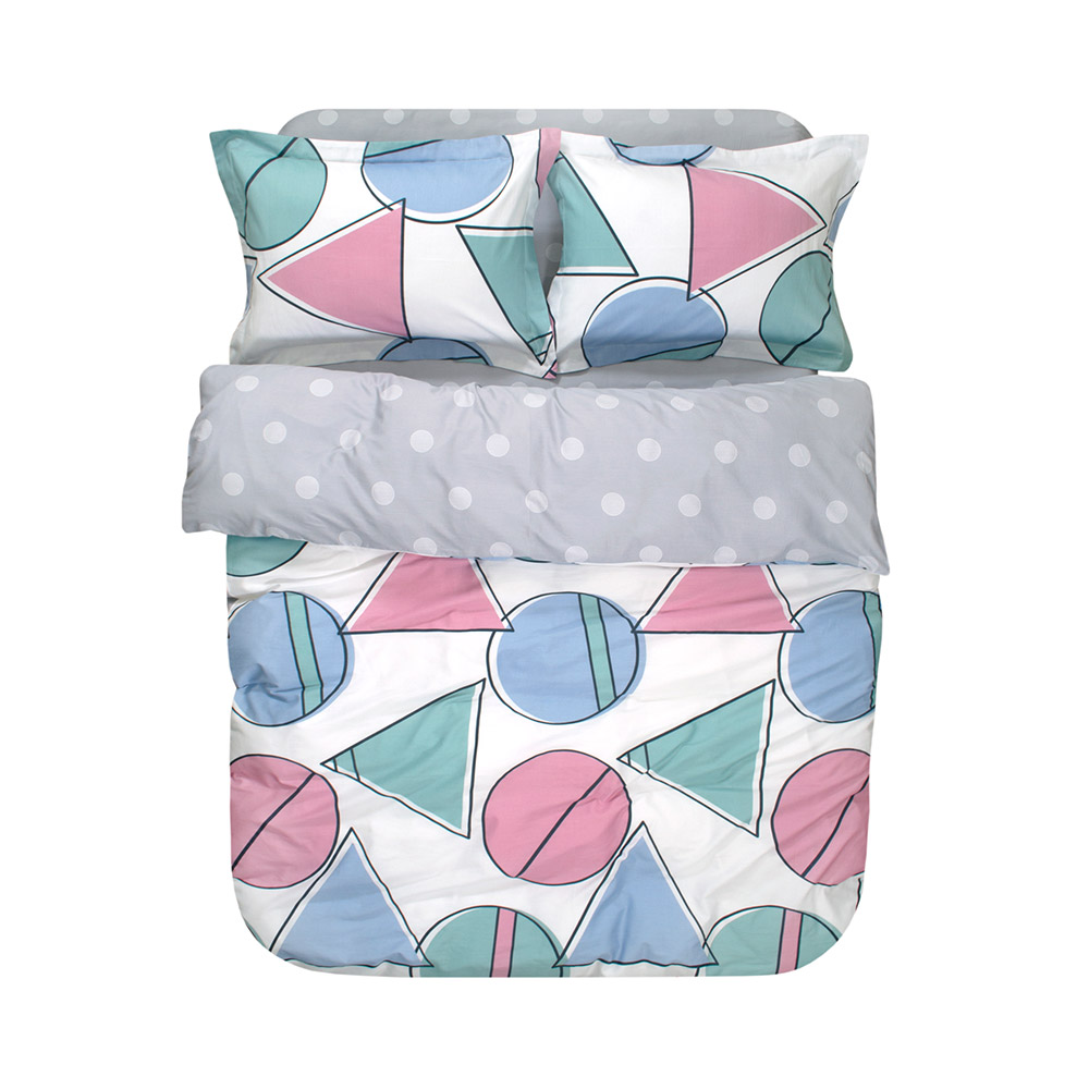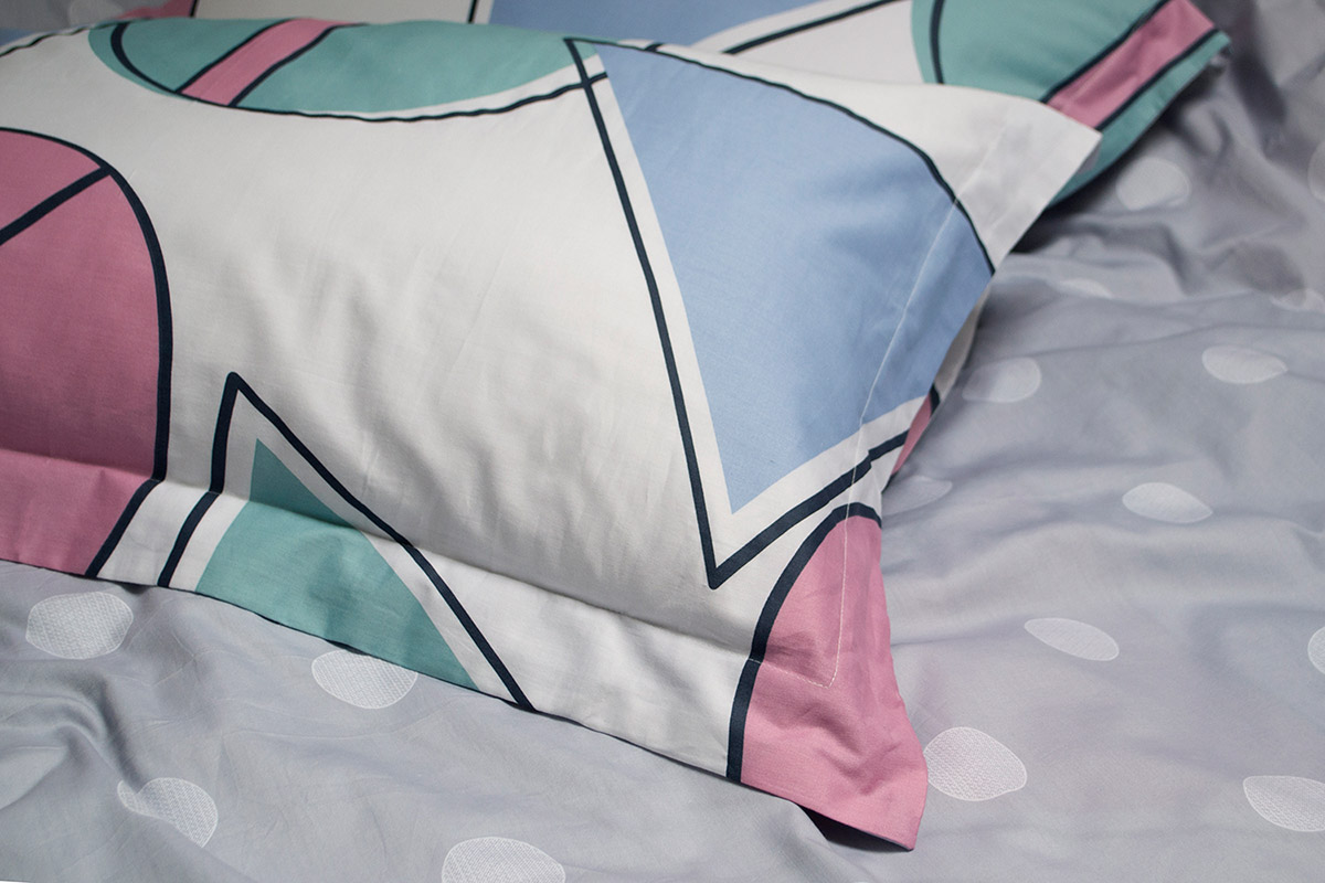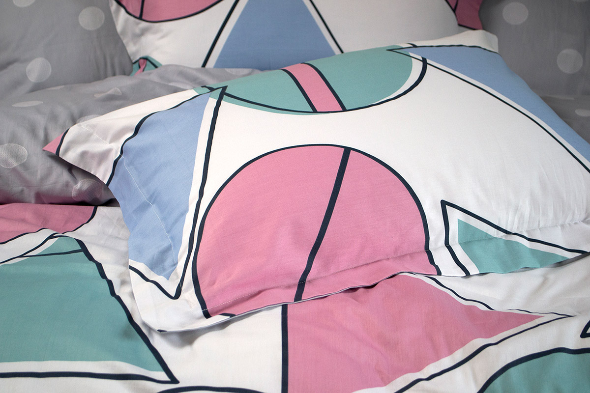Качественное сатиновое постельное белье. Разноцветный абстрактный принт с геометрическими мотивами отлично сочетается с симпатичными горошками на сером фоне. Натуральная хлопковая ткань с нежной и гладкой фактурой обеспечит максимально комфортный и приятный сон.
