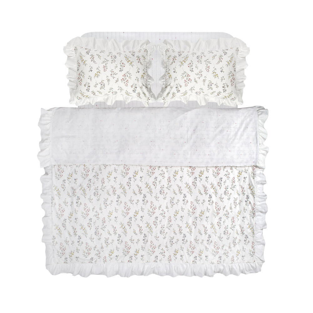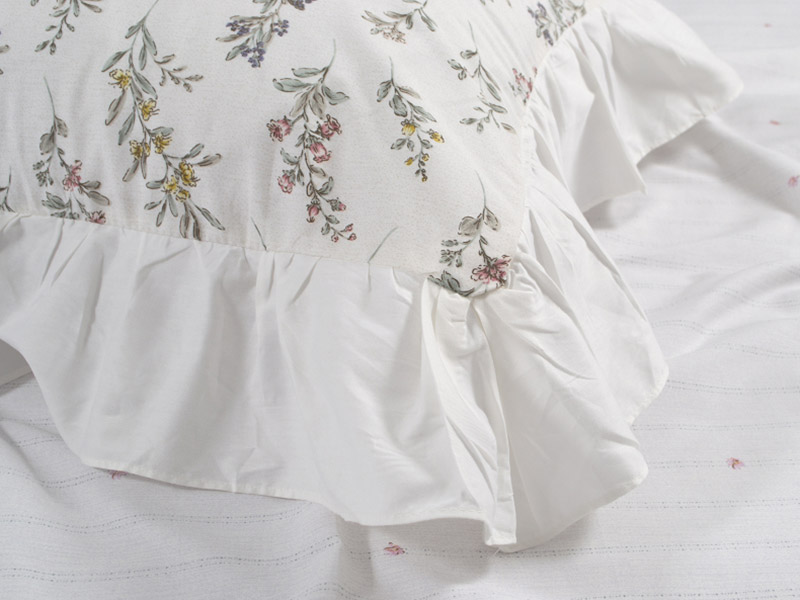 Качественное сатиновое постельное белье белого цвета с декоративными рюшами и с красивым цветочным принтом. Комплект смотрится нежно и элегантно в интерьере, делает спальню уютной и неповторимой. Натуральная хлопковая ткань с нежной и гладкой фактурой обеспечит максимально комфортный и приятный сон.