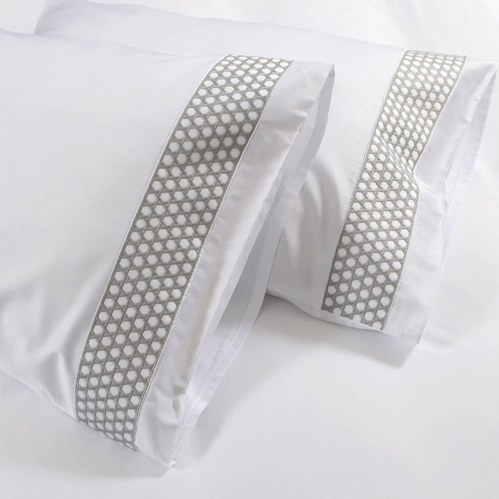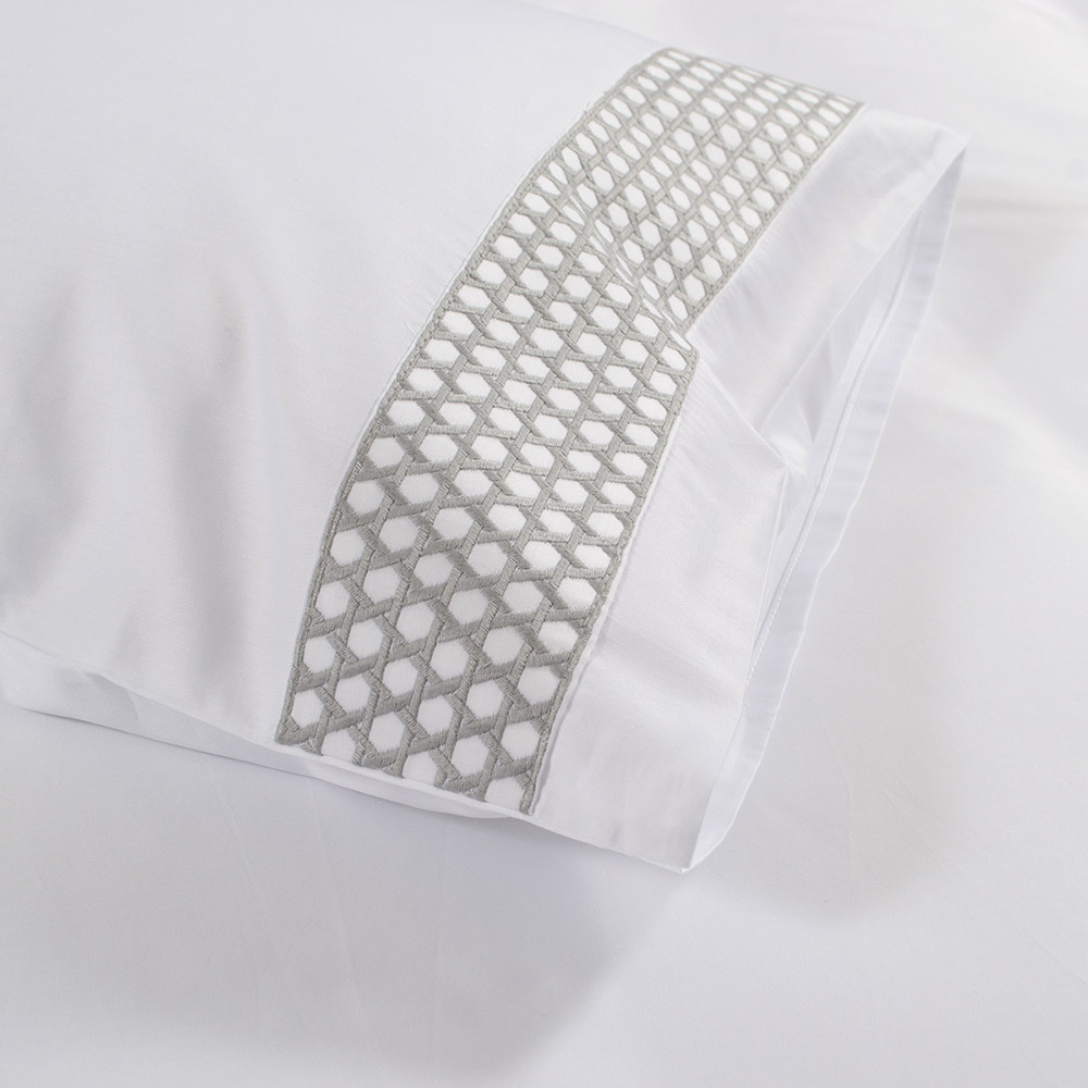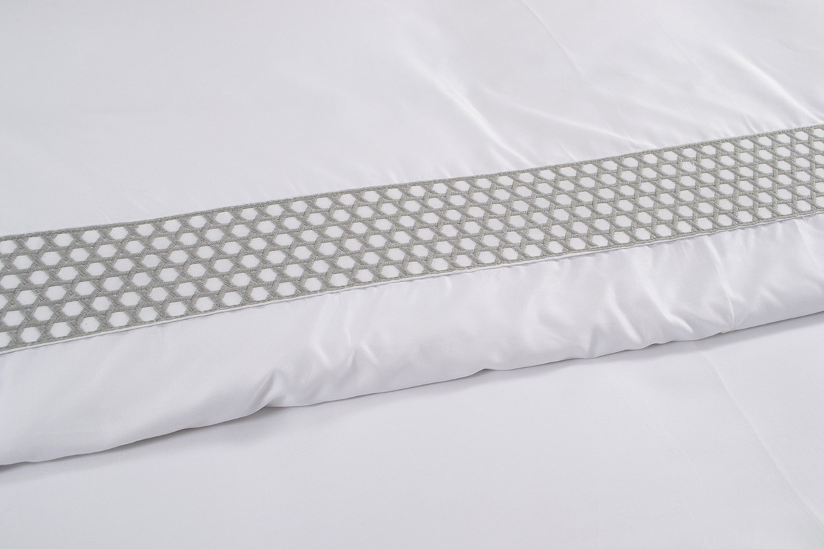 Набор премиум-класса состоит из пододеяльника и двух наволочек. Изделия белого цвета с серой вышивкой, выполнены из натурального хлопка. Мягкий и шелковистый сатин класса king создается из ультратонких хлопковых нитей высочайшего качества согласно установленному стандарту повышенной плотности - 300 TC (по мировому критерию Thread counts «TC»). Ткань нежная на ощупь, отлично пропускает воздух, обеспечивает максимально комфортный и приятный сон.