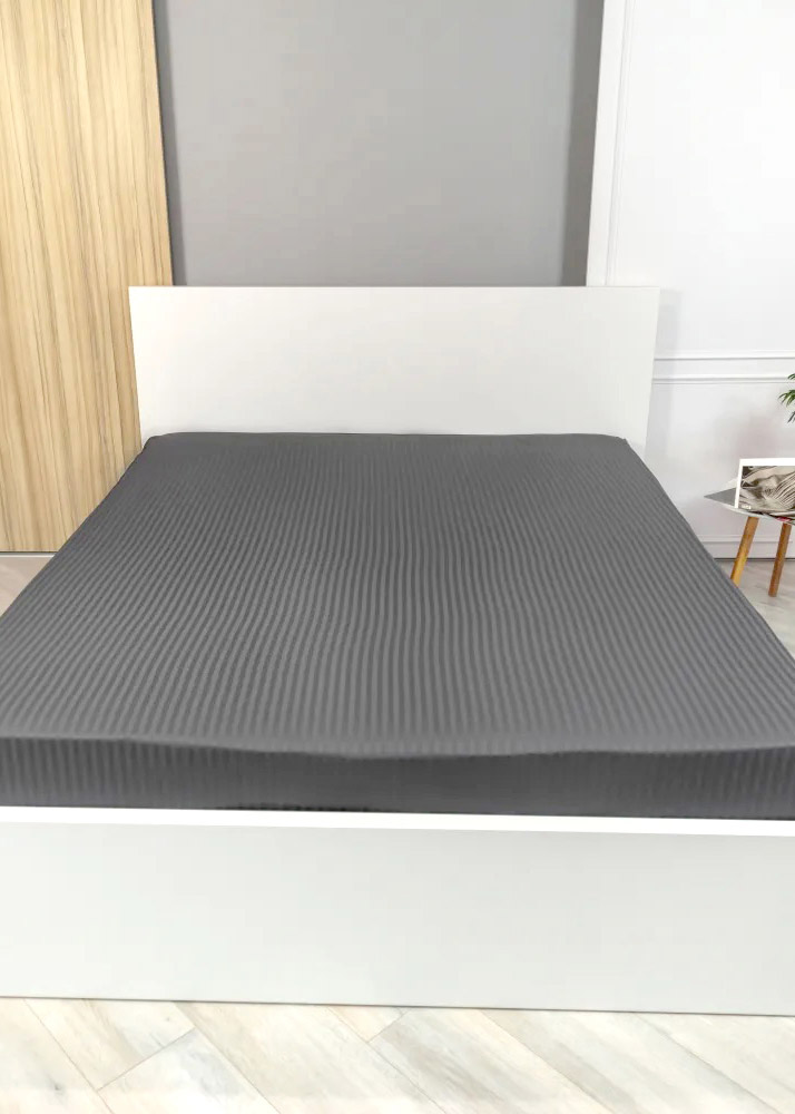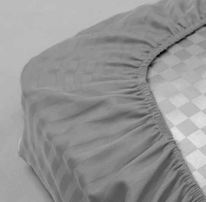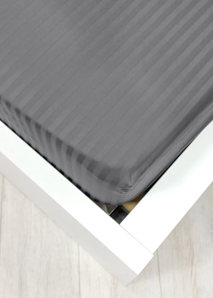 Натяжная простынь из качественного сатина серого цвета с красивыми жаккардовыми полосками. Ткань из натурального хлопка мягкая и приятная на ощупь, прочная и долговечная в эксплуатации. Благодаря резинке простынь легко и быстро одевается на матрас, надежно фиксируется и не сползает во время эксплуатации.