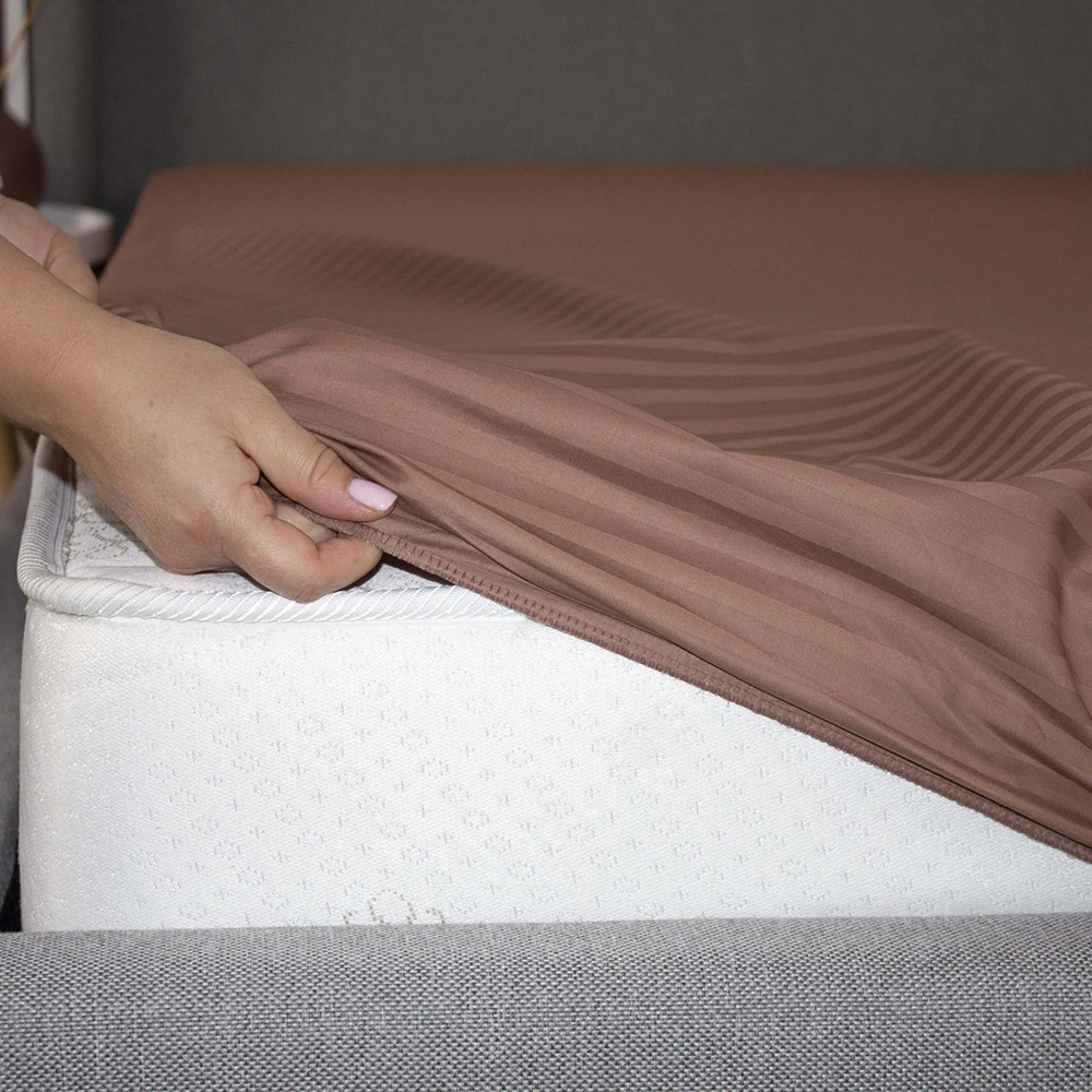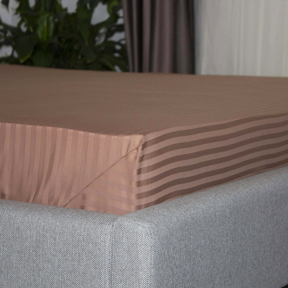 Однотонная простынь коричневого цвета с красивыми жаккардовыми полосками. Простынь выполнена из мягкого качественного сатина. Благодаря эластичной резинке, простынь надежно фиксируется на матрасе, не сползает, не образует складок. Ткань из натурального хлопка нежная на ощупь, прекрасно пропускает воздух, дарит максимально комфортный и приятный сон.