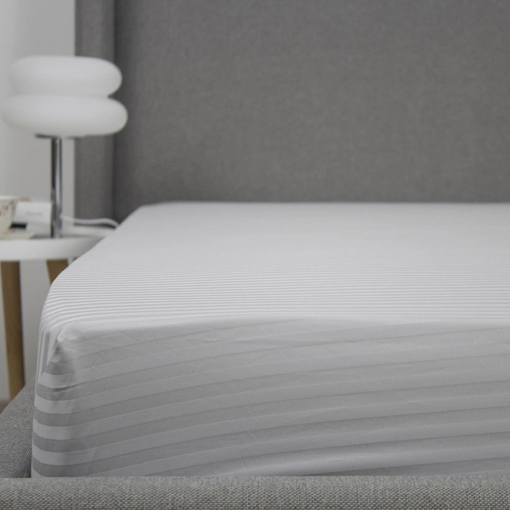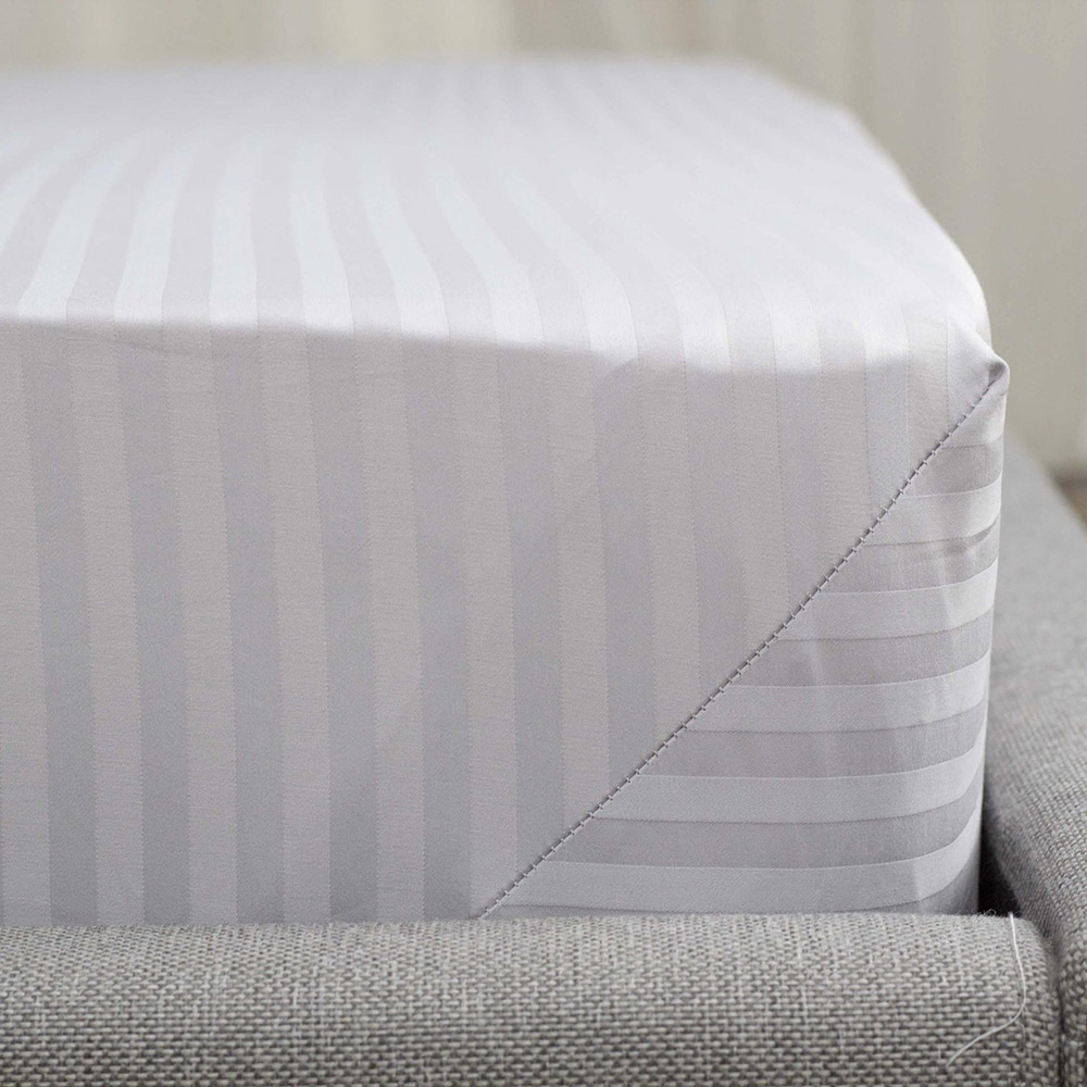 Однотонная простынь светло-серого цвета с красивыми жаккардовыми полосками. Простынь выполнена из мягкого качественного сатина. Благодаря эластичной резинке, простынь надежно фиксируется на матрасе, не сползает, не образует складок. Ткань из натурального хлопка нежная на ощупь, прекрасно пропускает воздух, дарит максимально комфортный и приятный сон.