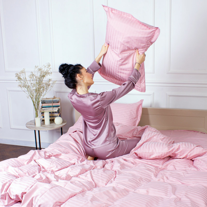 Однотонное постельное белье розового цвета с красивыми жаккардовыим полосками. Комплект станет нежным акцентом в интерьере, сделает спальню более уютной. Комплект выполнен из мягкого высококачественного сатина. Нежная и шелковистая ткань из натурального хлопка обеспечит максимально комфортный и приятный сон.