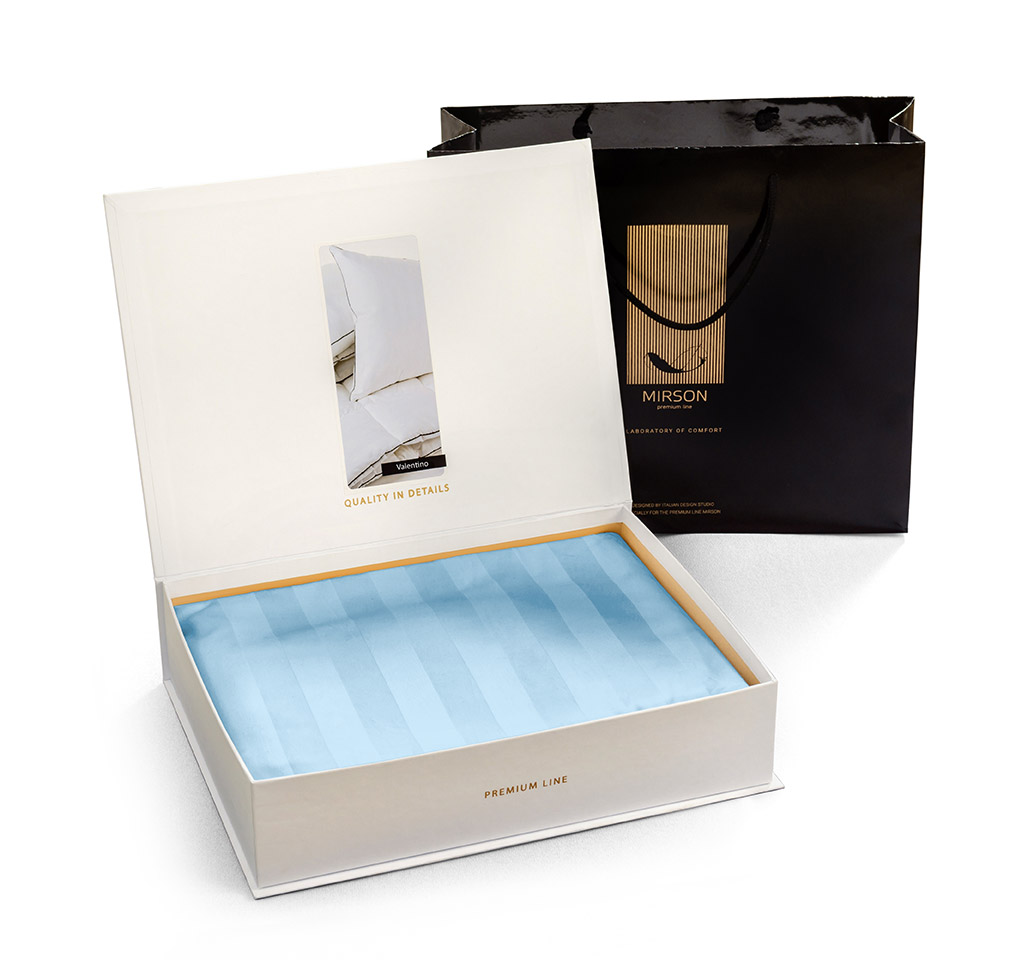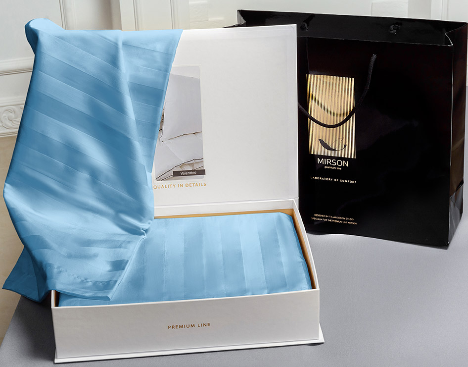 Постельное белье MirSon Valentino сатин-жаккард. Нежное белье в голубом оттенке из красивой итальянской ткани сатин-жаккард - подарит комфорт и эстетическое наслаждение. Комплект сшит из египетского хлопка в сатиновом плетении, ткани которая очень износостойкая и приятная на ощупь. Постельный комплект упакован в великолепную фирменную коробку, благодаря чему станет замечательным и эффектным подарком.