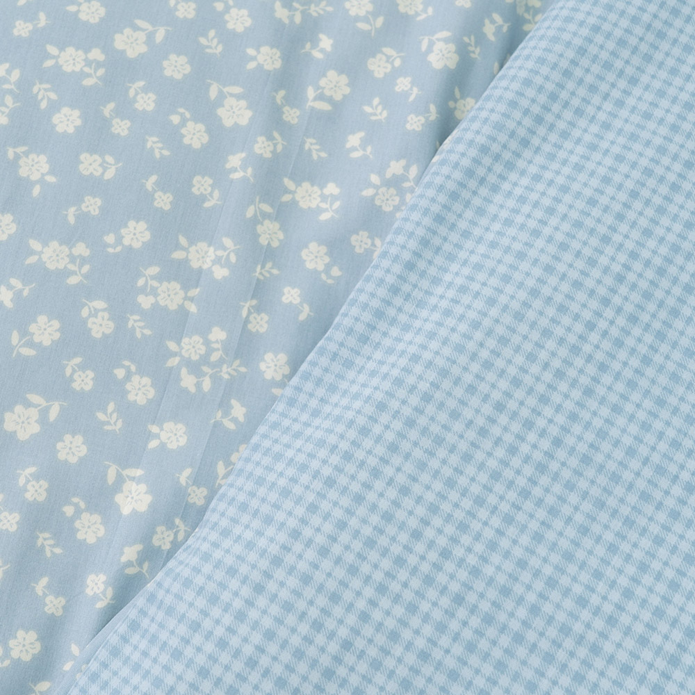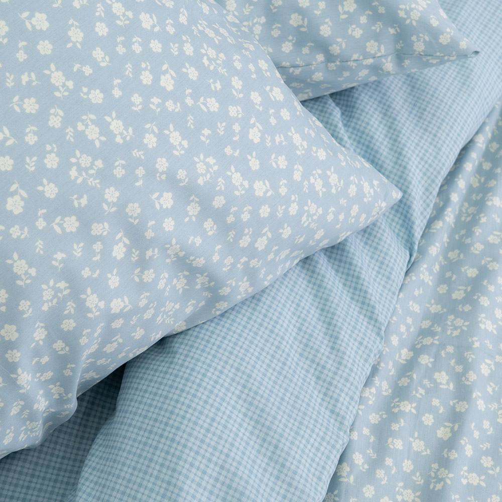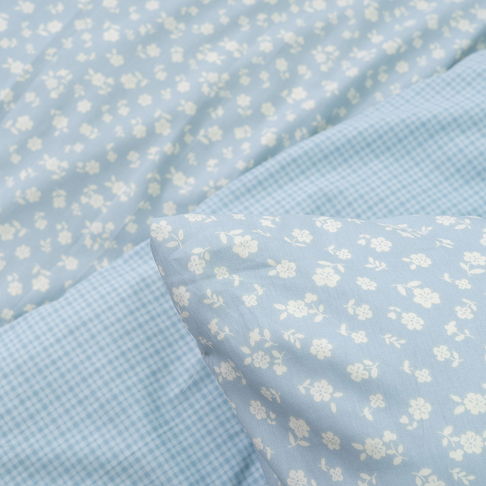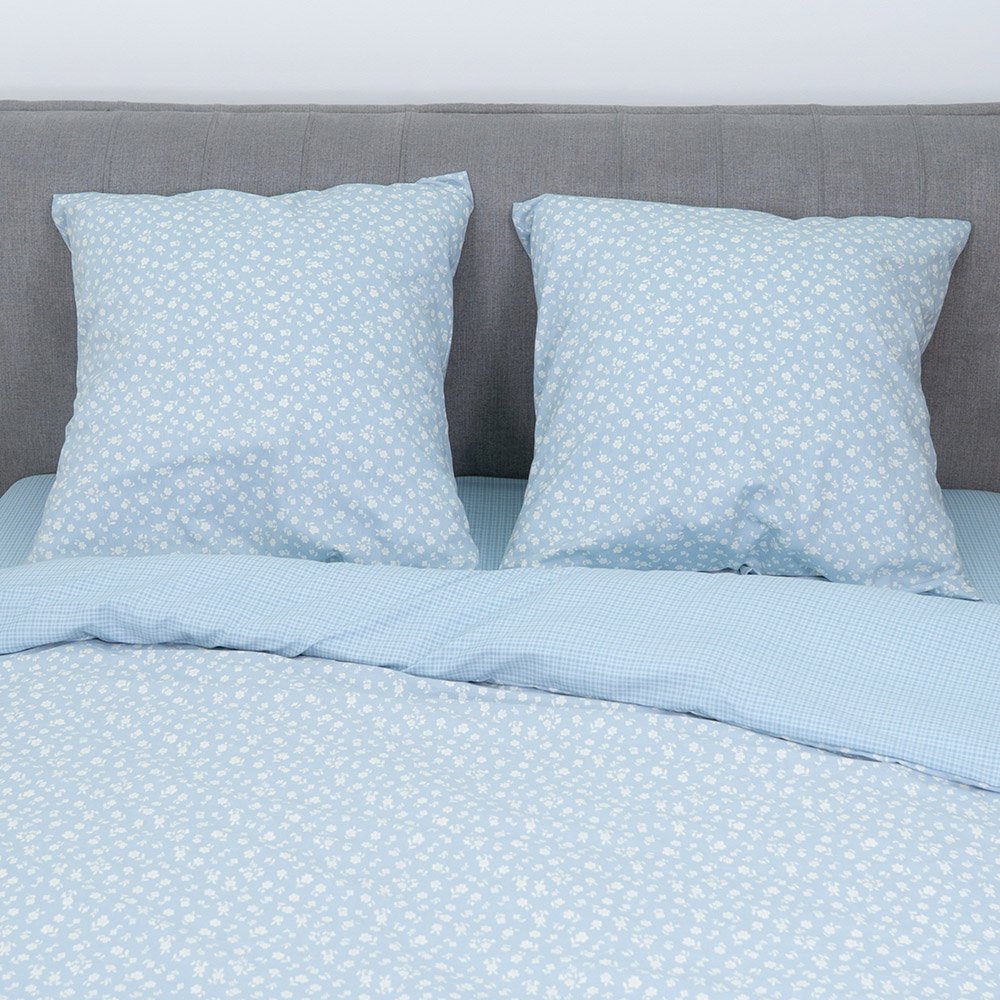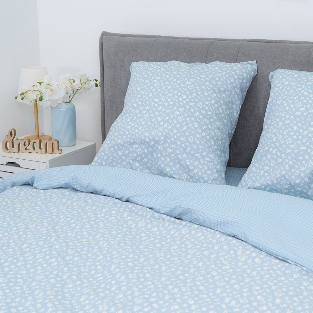 Сатиновое постельное белье голубого цвета с симпатичным принтом с цветочками и клеточками. Комплект сделает спальню более уютной, замечательно дополнит интерьер. Мягкая и нежная ткань из натурального хлопка подарит максимально комфортный и приятный сон.