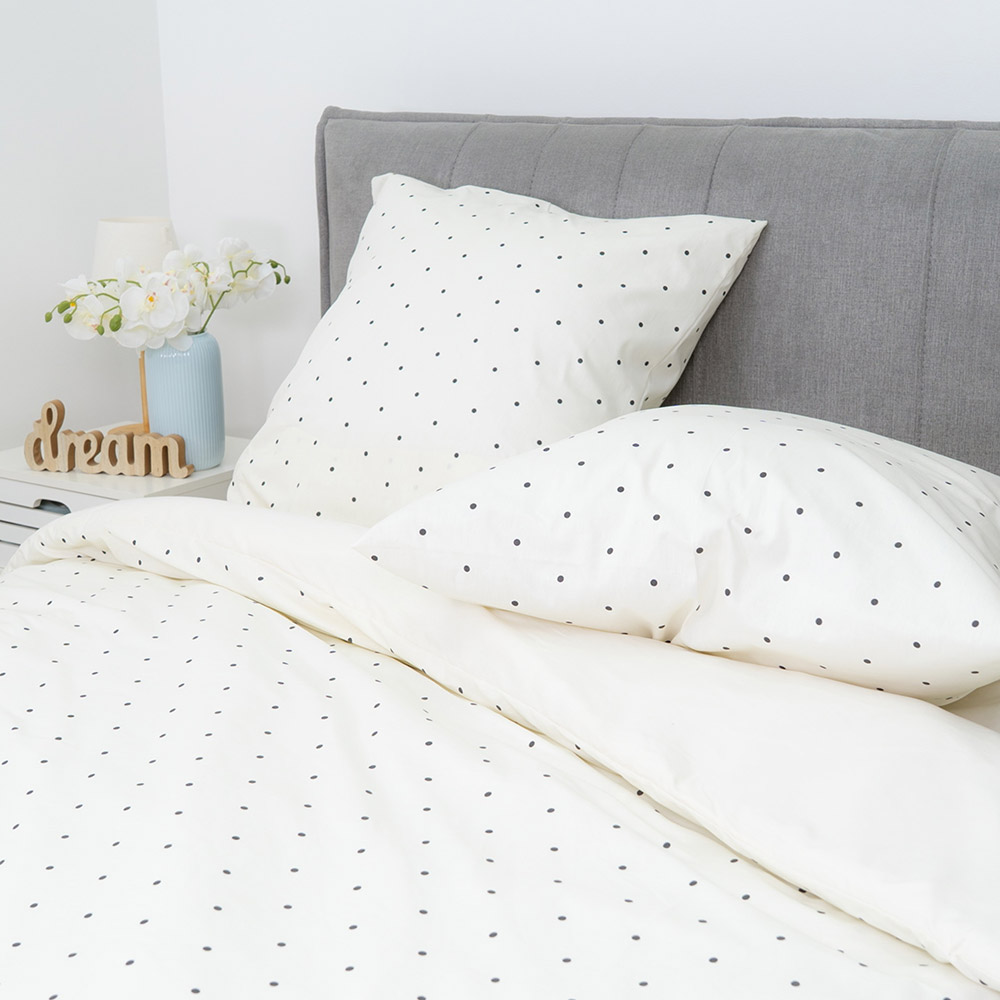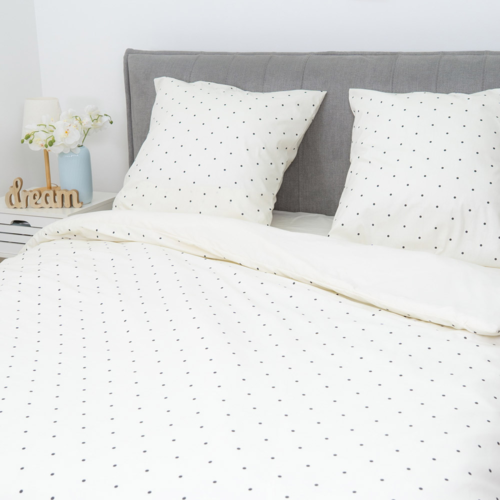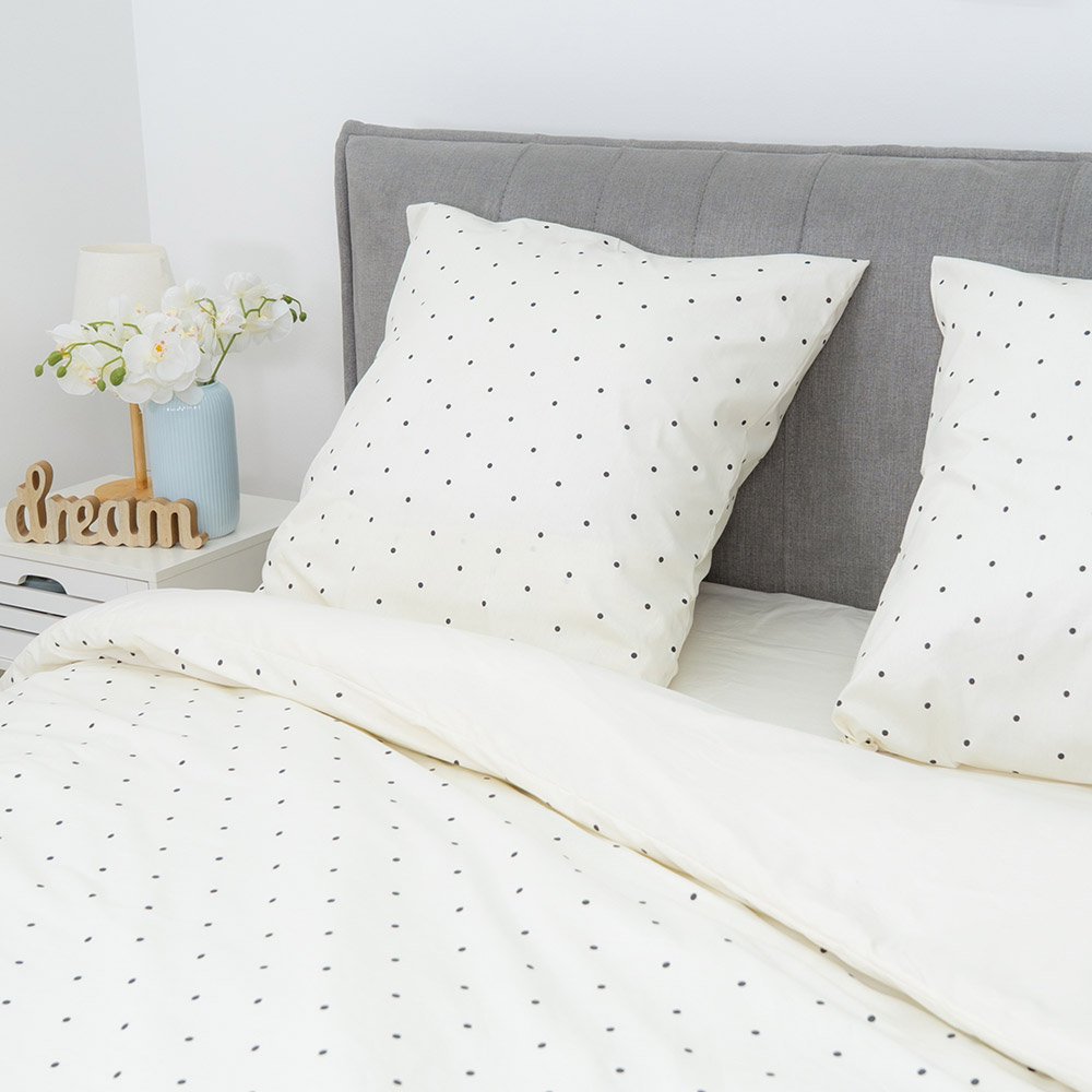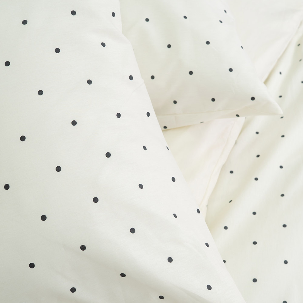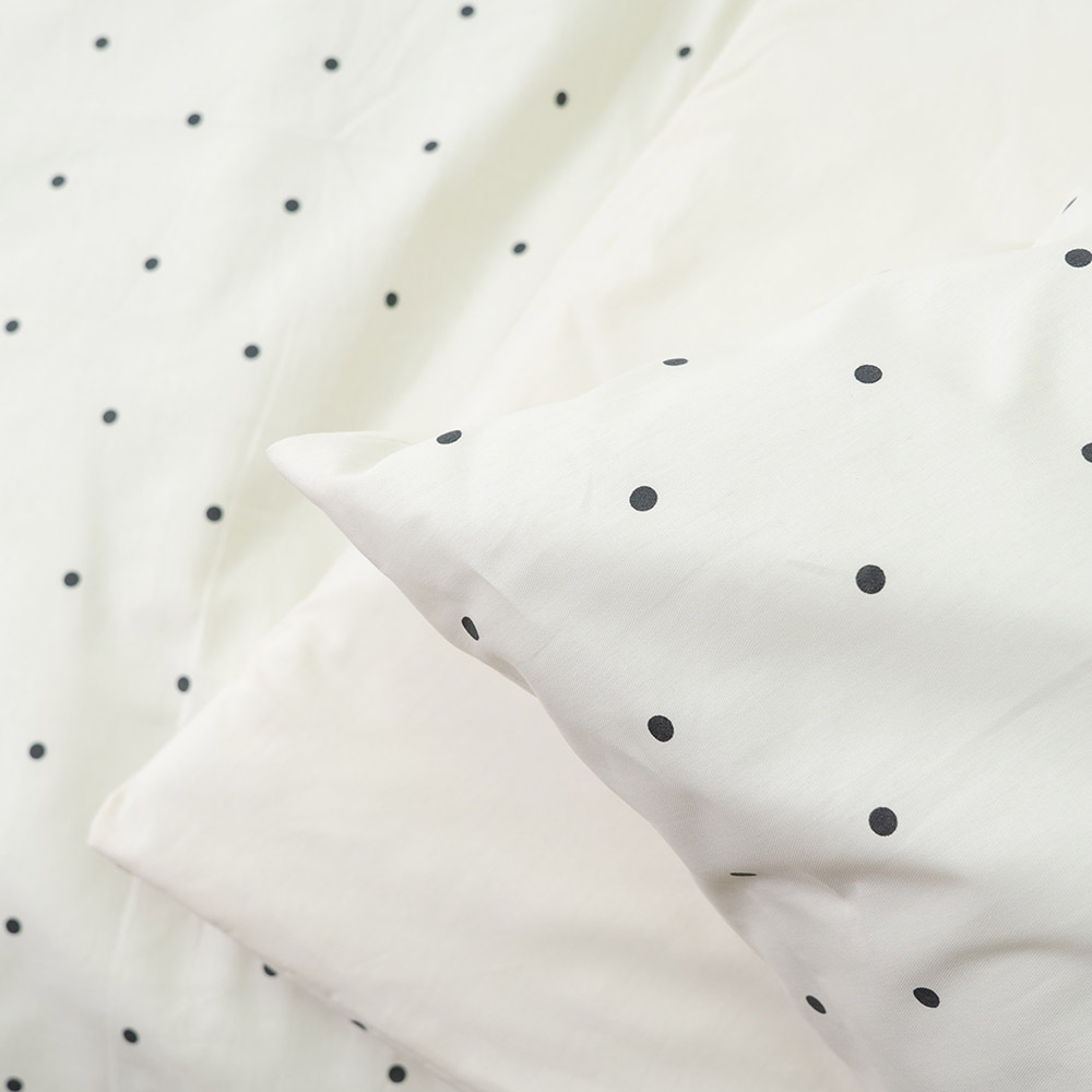 Сатиновое постельное белье молочного цвета с принтом в горошек. Комплект замечательно дополнит интерьер, сделает спальню более уютной. Мягкая и нежная ткань из натурального хлопка подарит максимально комфортный и приятный сон.