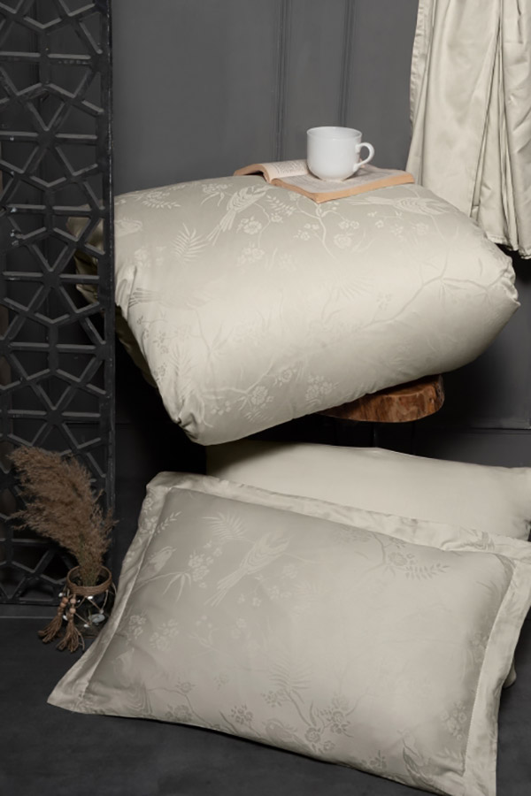 Изысканный комплект нежного бежевого цвета. Красивый жаккардовый узор с птицами и цветами создает ощущение гармонии и уюта, располагает к спокойному отдыху и расслаблению. Качественная сатиновая ткань мягкая и приятная на ощупь, шелковистая, производится из натурального хлопка, обеспечивает максимально комфортный сон.