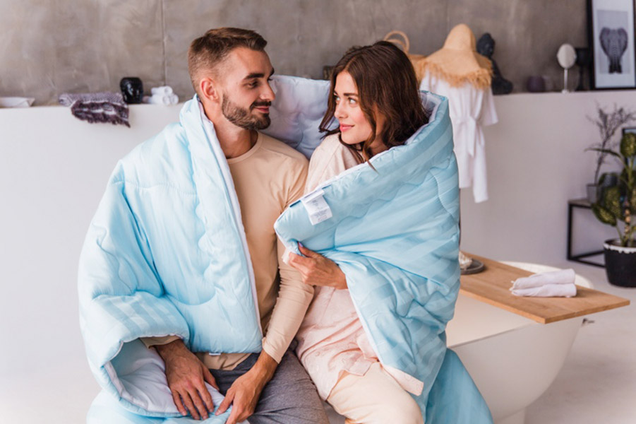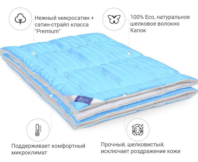 Превосходное легкое одеяло для лета. Одеяло с наполнителем из натурального растительного шелкового волокна. Растительный шелк капок обладает прекрасными терморегулирующими свойствами, не парит, не вызывает аллергии, легкий и воздушный. Наполнитель равномерно распределен и простеган по всему одеялу. С одной стороны одеяла — высококачественный нежный сатин голубого цвета с красивыми жаккардовыми полосками. Ткань премиум-класса, гладкая и шелковистая, производится из 100% хлопка, смотрится элегантно и красиво. Другая сторона выполнена из итальянского микросатина белого цвета. Ткань на основе хлопка и полиэфирного волокна простая в уходе, мягкая и приятная на ощупь. Преимущества одеял из серии Hand made: ручная сортировка наполнителя, ручной пошив, качественные материалы, итальянские ткани, тщательный контроль качества.