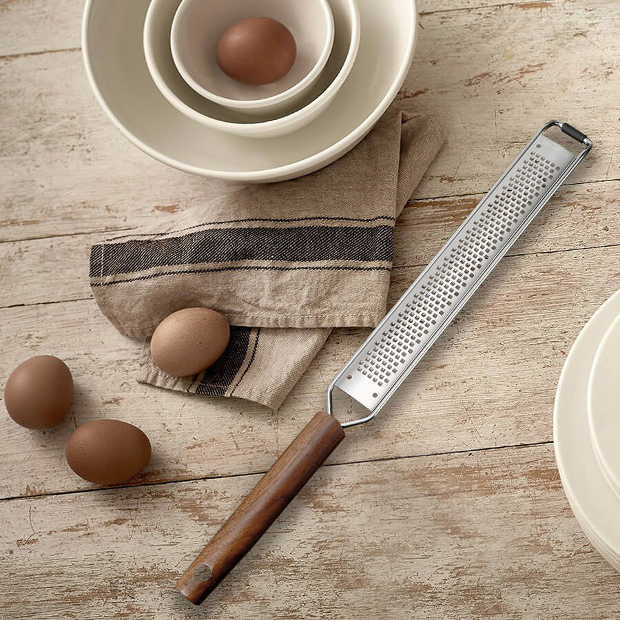 Терка выполнена из высококачественной нержавеющей стали с удобной деревянной ручкой и пластиковым чехлом. Терка станет незаменимой для ручной натирки продуктов. Стильный современный дизайн делает это устройство не только практичным, но и красивым предметом на кухне.