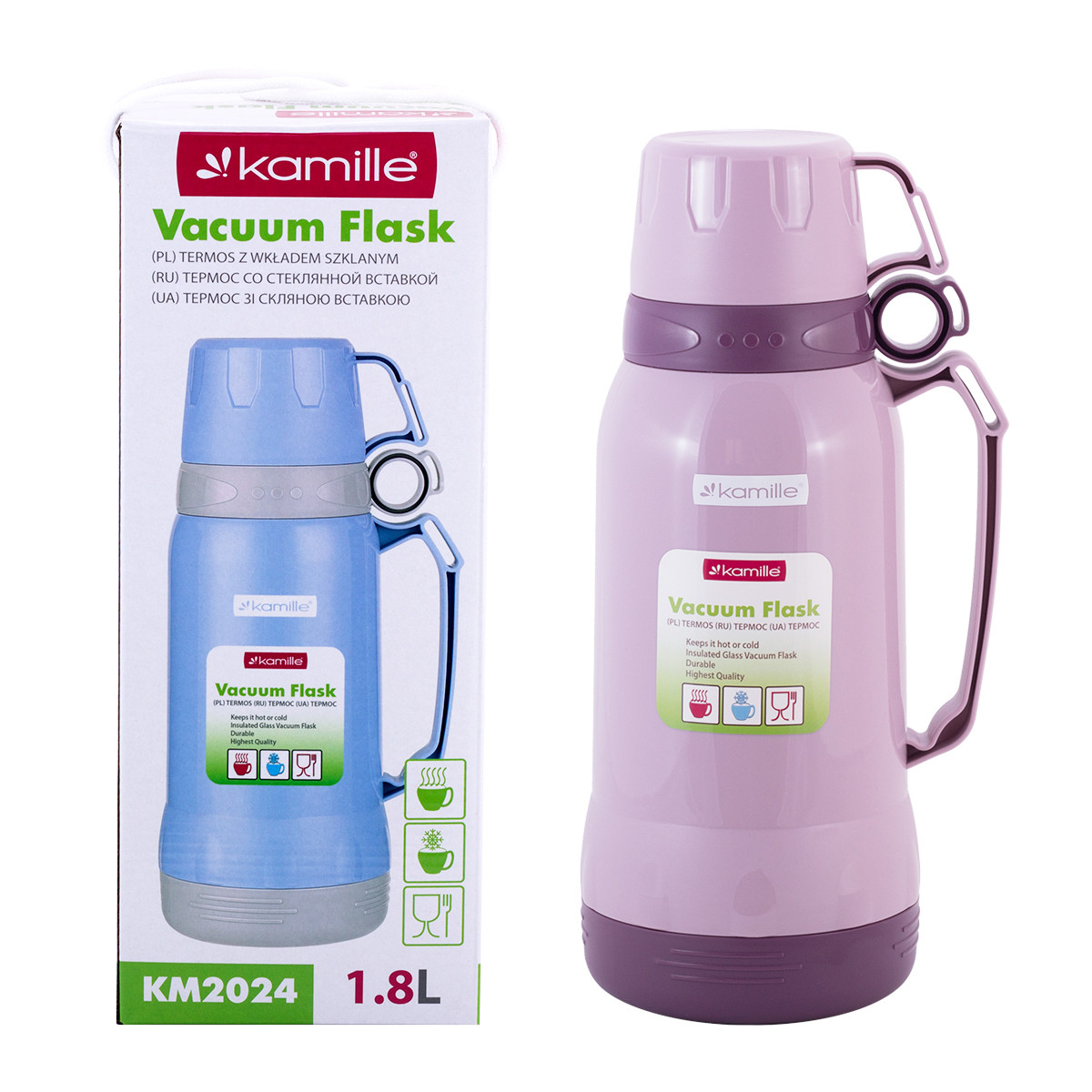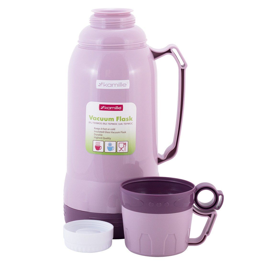 Термос Kamille 1800мл 2024 фиолетовый пластиковый со стеклянной колбой обладает высоким качеством, надежностью, компактными размерами и эстетичным дизайном. Такой термос станет незаменимым в машине, на отдыхе или в путешествии.