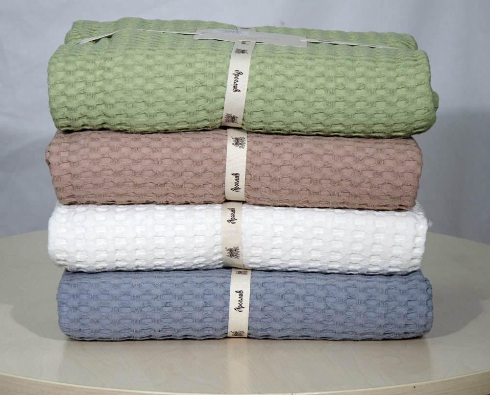 Однотонная простынь оливкового цвета. Простынь выполнена из натуральной хлопковой ткани с рельефной вафельной фактурой. Материал легкий и приятный на ощупь, отлично пропускает воздух, обеспечивает ощущение уюта и комфорта. Простынь можно также использовать как летнее одеяло или для походов в сауну или СПА.