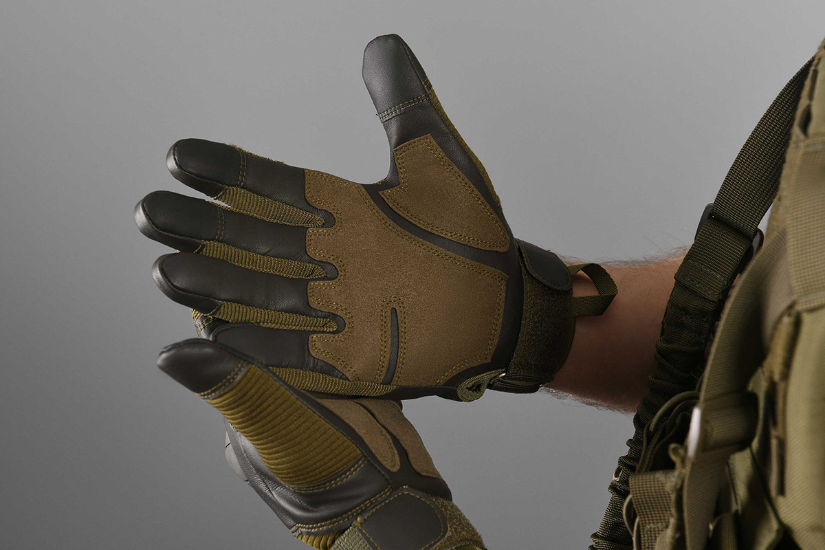 Тактические перчатки цвета хаки. Перчатки незаменимы как в боевых условиях, так и для активного отдыха и занятий спортом в мирное время. Перчатки подойдут для тактической тренировки и стрельбы, страйкбола, езды на мотоцикле и горных велосипедах. Модель с регулируемыми манжетами, надежно защищает руки от механических и термических повреждений, в то же время обеспечивает циркуляцию воздуха, хорошо облегает руку и не сковывает движения. На больших, указательных и средних пальцах обеих перчаток имеются вставки из специального материала, позволяющие пользоваться сенсорными электронными устройствами.
