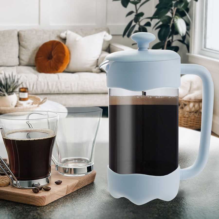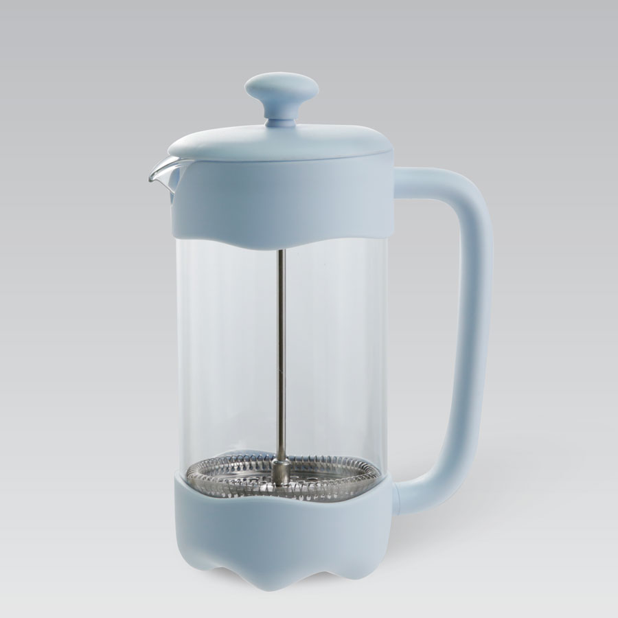 Френч-пресс 0,6 л Maestro MR1669-600 голубой. Оснащен металлическим механизмом отделения твердого остатка. Колба изготовлена из жаропрочного боросиликатного стекла.