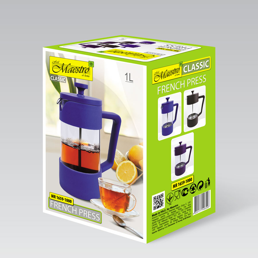 Френч-пресс Maestro 1,0л MR-1659-1000 - красивый, практичный атрибут для заваривания кофе и чая. Такая посуда позволит наслаждаться любимым горячим напитком каждый день. Емкость выполнена из жаропрочного стекла в пластиковой оправе высокого качества.
