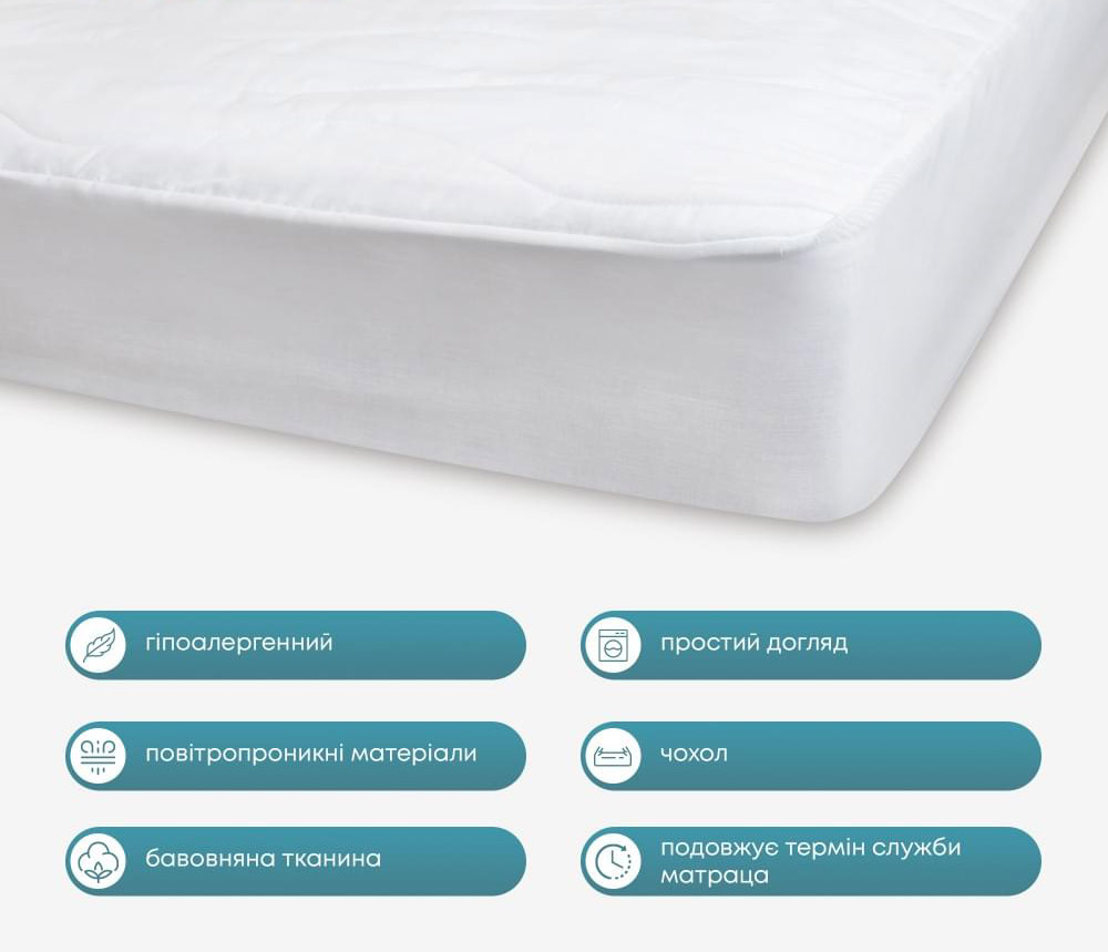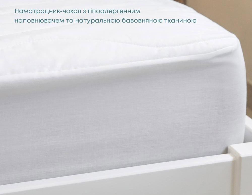 Стьобаний наматрацник із натуральної бавовняної тканини з м'яким антиалергенним наповнювачем. Наматрацник підвищить комфорт спального місця та продовжить термін служби матраца. Виріб легко одягається на матрац і надійно фіксується за допомогою еластичного подола на гумці, не сповзає під час експлуатації.