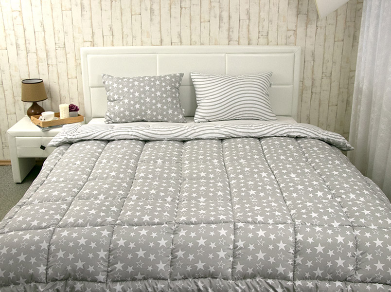 Дуже тепла ковдра в чохлі з м'якої та приємної на дотик мікрофібри зі стібкою квадратами. Одна сторона ковдри — сірого кольору з красивим малюнком зірок, а інша — з хвилястими біло-сірими лініями. Наповнювач із силіконового волокна не викликає алергії, комфортний і легкий, практичний в експлуатації, добре зберігає тепло.