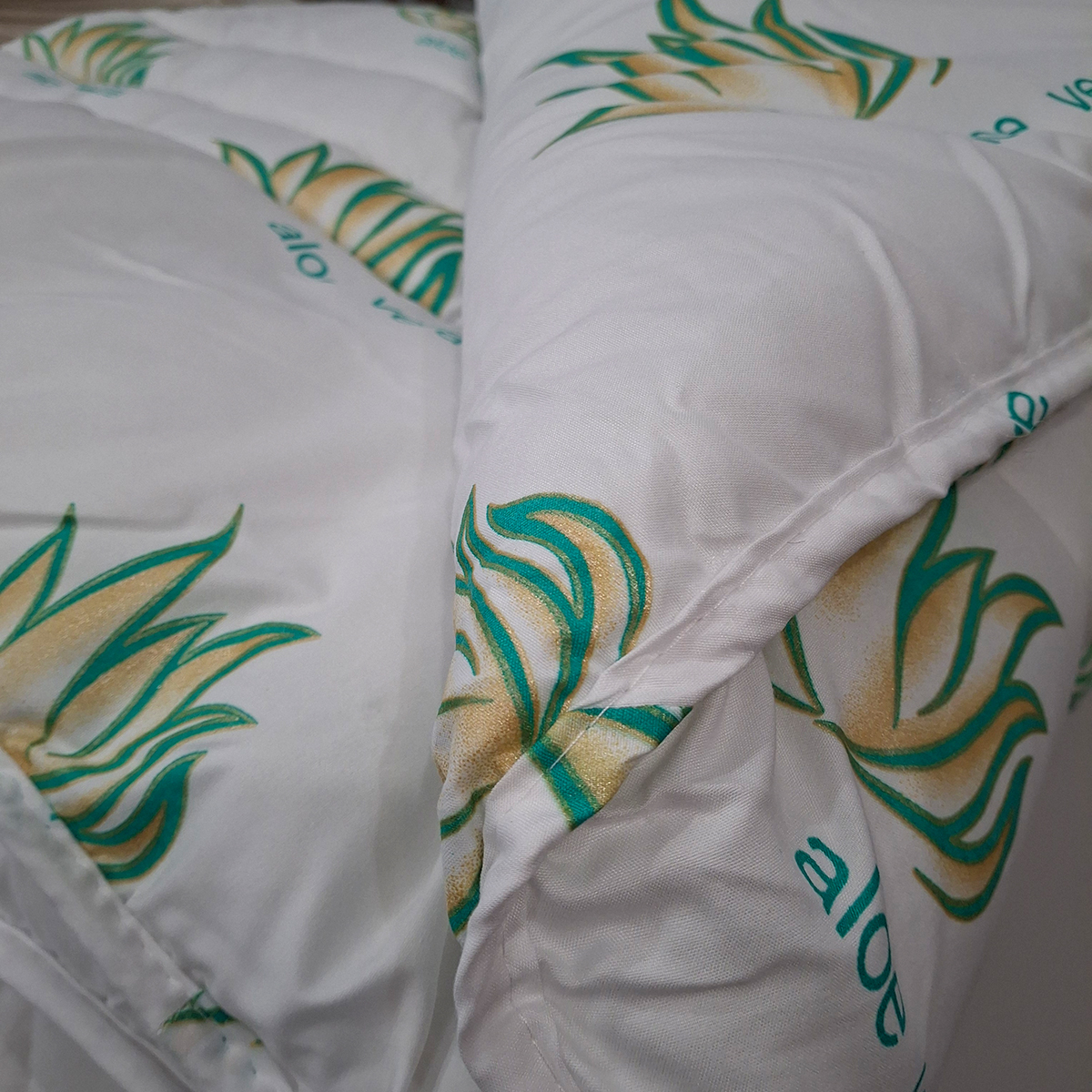 Ковдра з наповнювачем із поліефірного волокна. Наповнювач м'який, не викликає алергії. Чохол виробу виконаний із приємної якісної мікрофібри білого кольору з принтом. Завдяки просоченню алое віра, ковдра має антибактеріальні, регенеруючі та заспокійливі властивості, забезпечує здоровий і комфортний сон, підходить для чутливої шкіри.