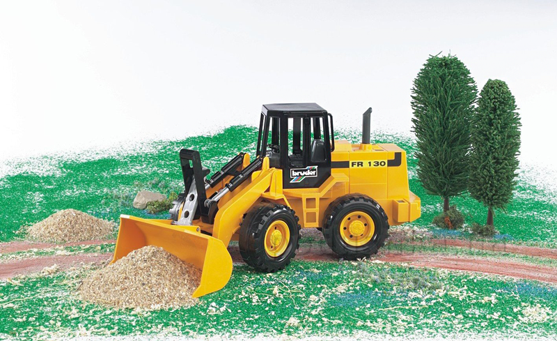 Дорожній навантажувач Bruder FR130, копія реальної техніки в зменшеному масштабі. Така іграшка безсумнівно сподобається хлопчику, адже вона так схожа на справжній навантажувач CAT. Особливістю такої машинки є підйомник великого ковша за рахунок телескопічного механізму за допомогою зручного важеля, розташованого біля кабіни, піднімається і опускається.