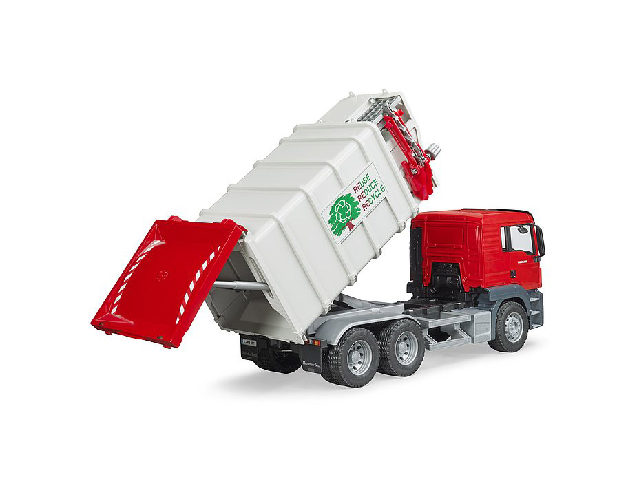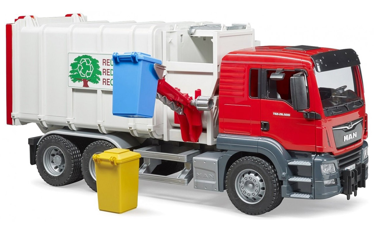 Модель сміттєвоза з бічним завантаженням MAN TGS. Підйомник висувається збоку, захоплює сміттєві контейнери та спорожняє їх. Два компактори переміщають відходи всередині завантажувального кузова до задньої частини. Після відкриття задніх дверей кузов нахиляється, щоб зробити розвантаження. Виконана модель із міцного пластику з дуже гарною деталізацією.