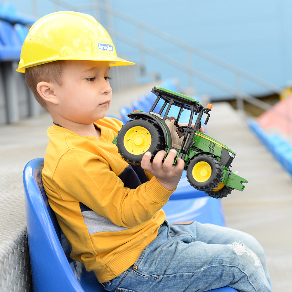 Реалістична модель трактора John Deere 5115M. Модель компактна, маневрена, ідеально працює в обмеженому просторі. Трактором можна керувати за допомогою додаткової тяги, помістивши її на рухоме кермо через зсувний дах.