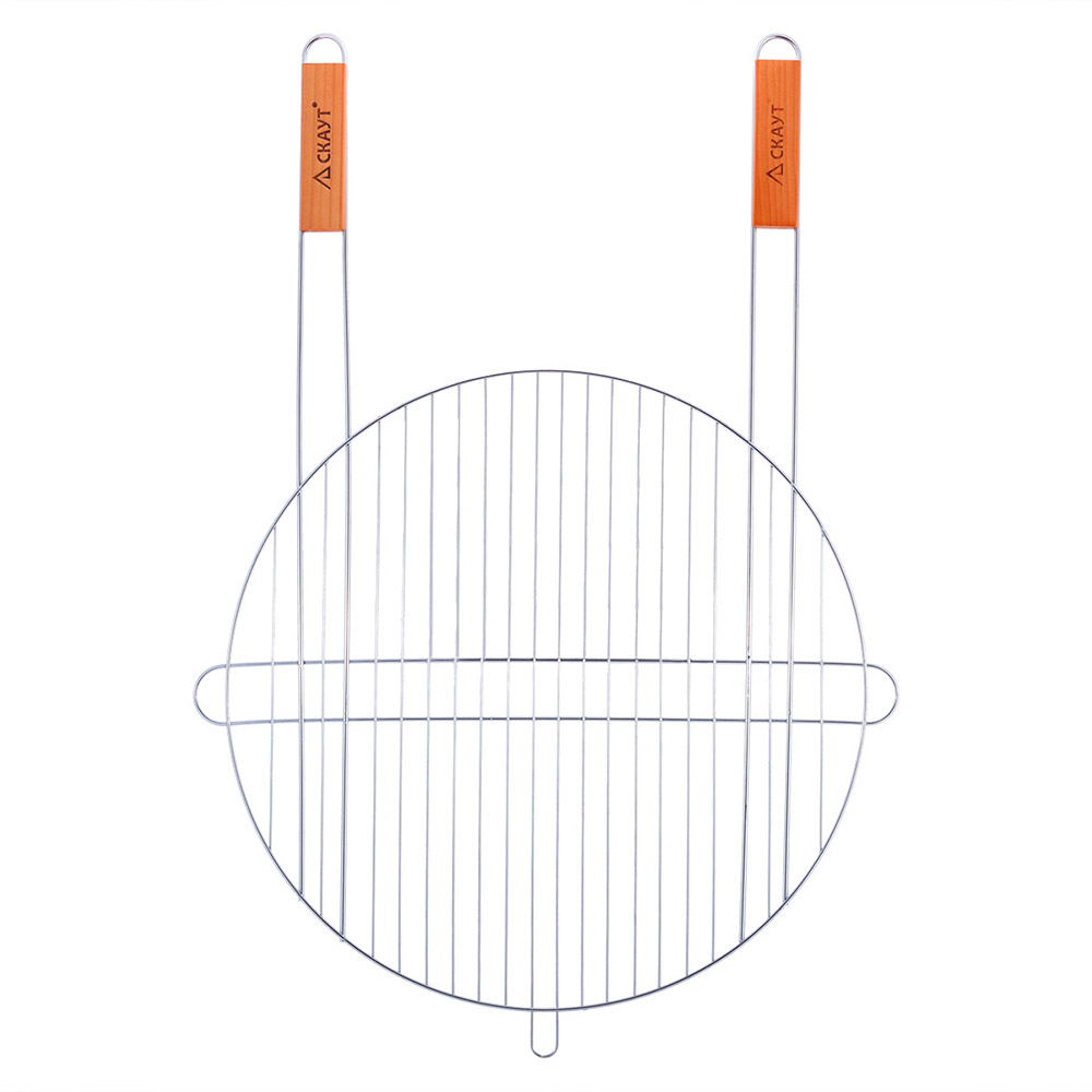 Кругла металева решітка з двома дерев'яними ручками. решітка незамінна для приготування їжі на відкритому повітрі. Решітка виконана з хромованої сталі, підходить для приготування різних продуктів. Спеціальна конструкція дозволяє зручно закріпити решітку на мангалі або жаровні.