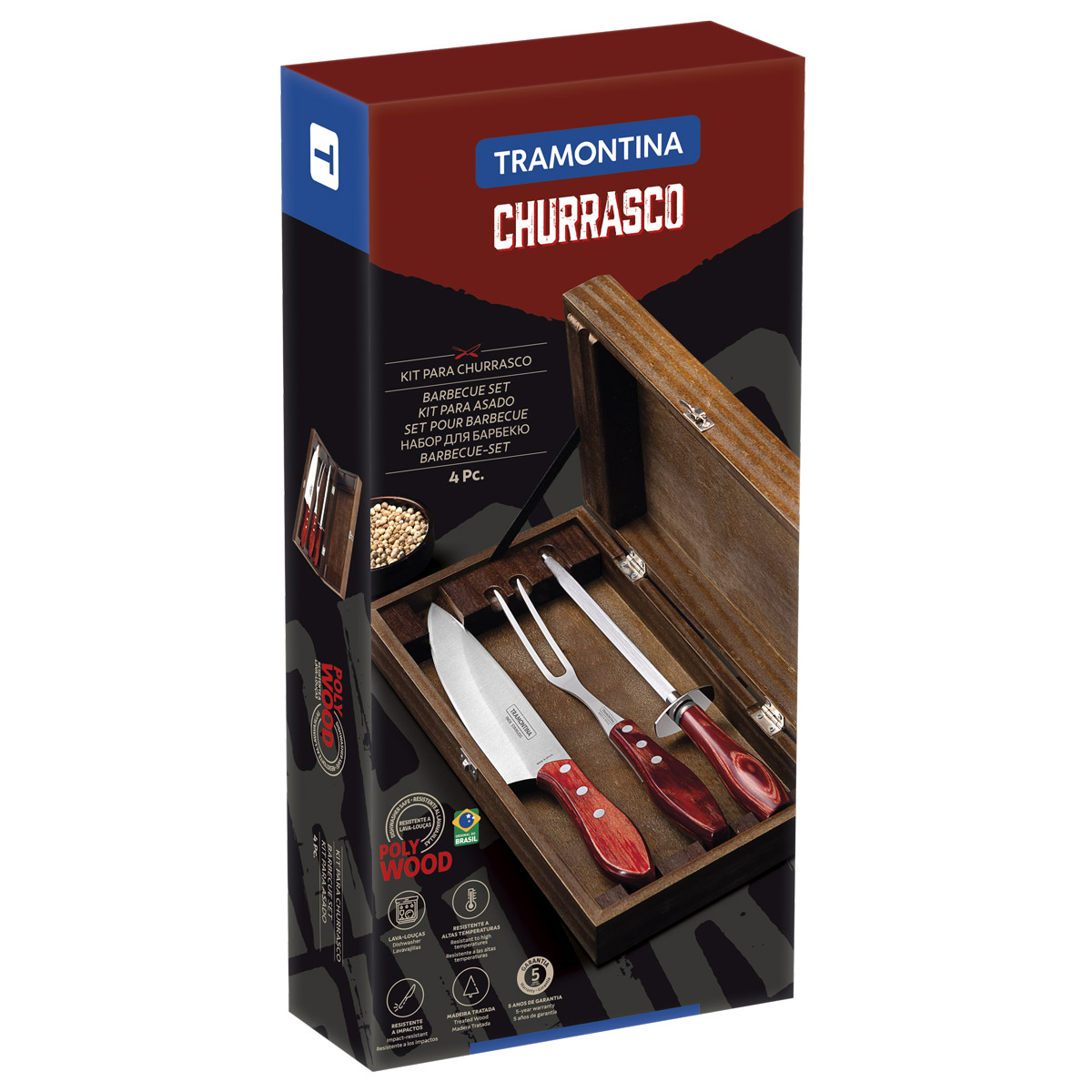 Набір для барбекю від Tramontina включає ніж, виделку і мусат, що ідеально підходять для приготування м'яса на грилі. Інструменти виготовлені з неіржавкої сталі, що забезпечує їхню довговічність і надійність. Ергономічні ручки з дерева забезпечують комфорт під час використання, а стильний дизайн надає набору елегантного вигляду. Цей набір стане незамінним аксесуаром для любителів барбекю і гриля.