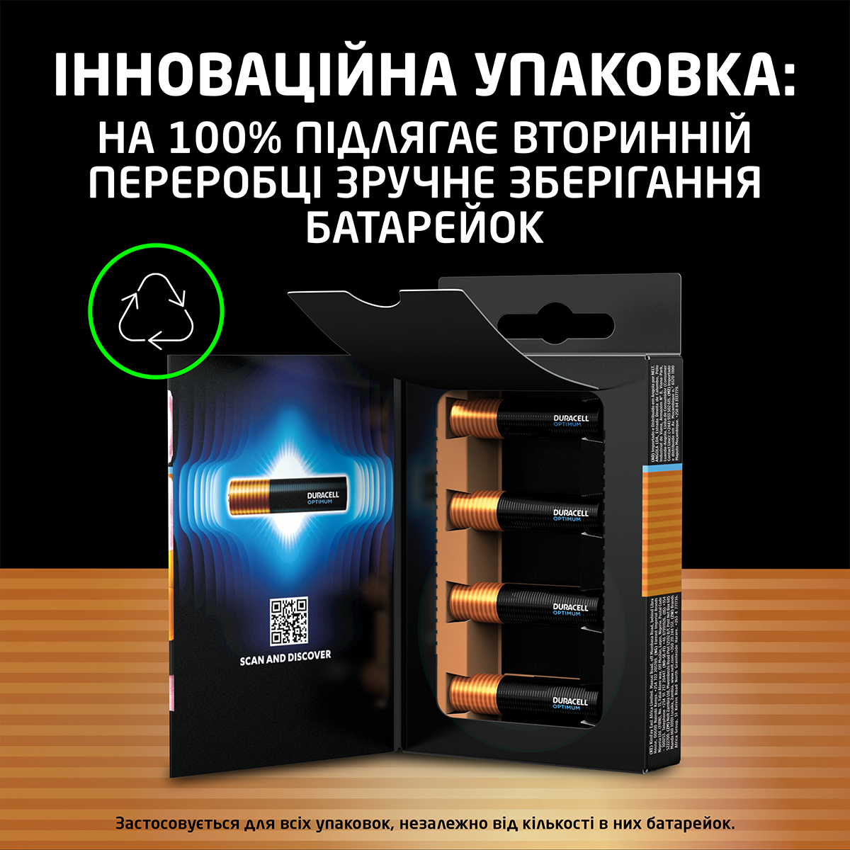 Нова та інноваційна упаковка у стилі "книжки" Duracell Optimum містить картонне віконце та органайзер, що означає, що батарейки більше не будуть кататися по кухонному ящику! Натомість ваші батарейки зручно та надійно зберігаються, поки вони вам не знадобляться. А коли батарейки розрядяться, ви можете знову зберігати їх в упаковці, готовими до подальшої переробки.
