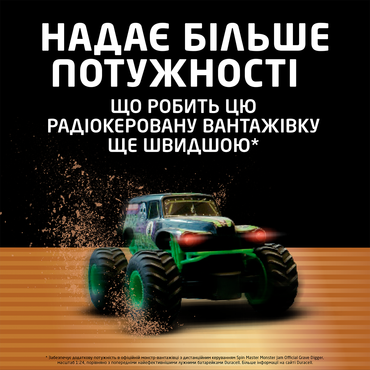 ПРАЦЮЄ ПОТУЖНІШЕ: у інших пристроях Duracell Optimum AAA забезпечує більше потужності, ніж провідні цинкові батарейки, завдяки чому вони працюють краще² - наприклад, двигуни працюють швидше в таких пристроях, як деякі іграшкові автомобілі з дистанційним керуванням (вантажівка Spinmaster Monster Jam, офіційна радіокерована вантажівка-монстр у масштабі 1:24) ?.