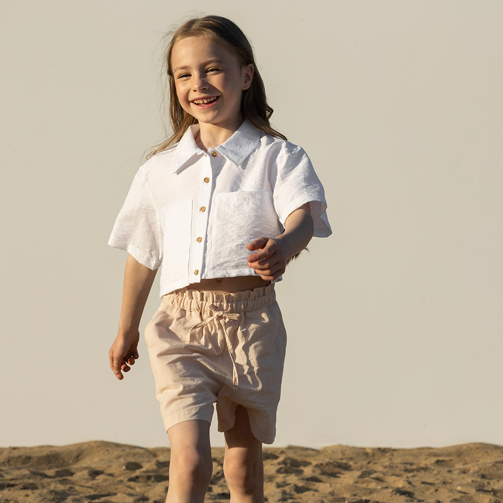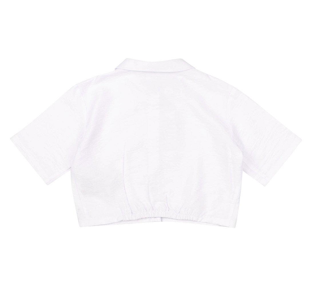 Однотонна літня сорочка білого кольору. Модель укорочена, з коміром, короткими рукавами, спереду - дві накладні кишені та ґудзики. Сорочка виконана з тканини котон-жатка. Матеріал із натуральної бавовни, легкий, приємний, чудово пропускає повітря, забезпечить дитині максимальний комфорт і затишок.