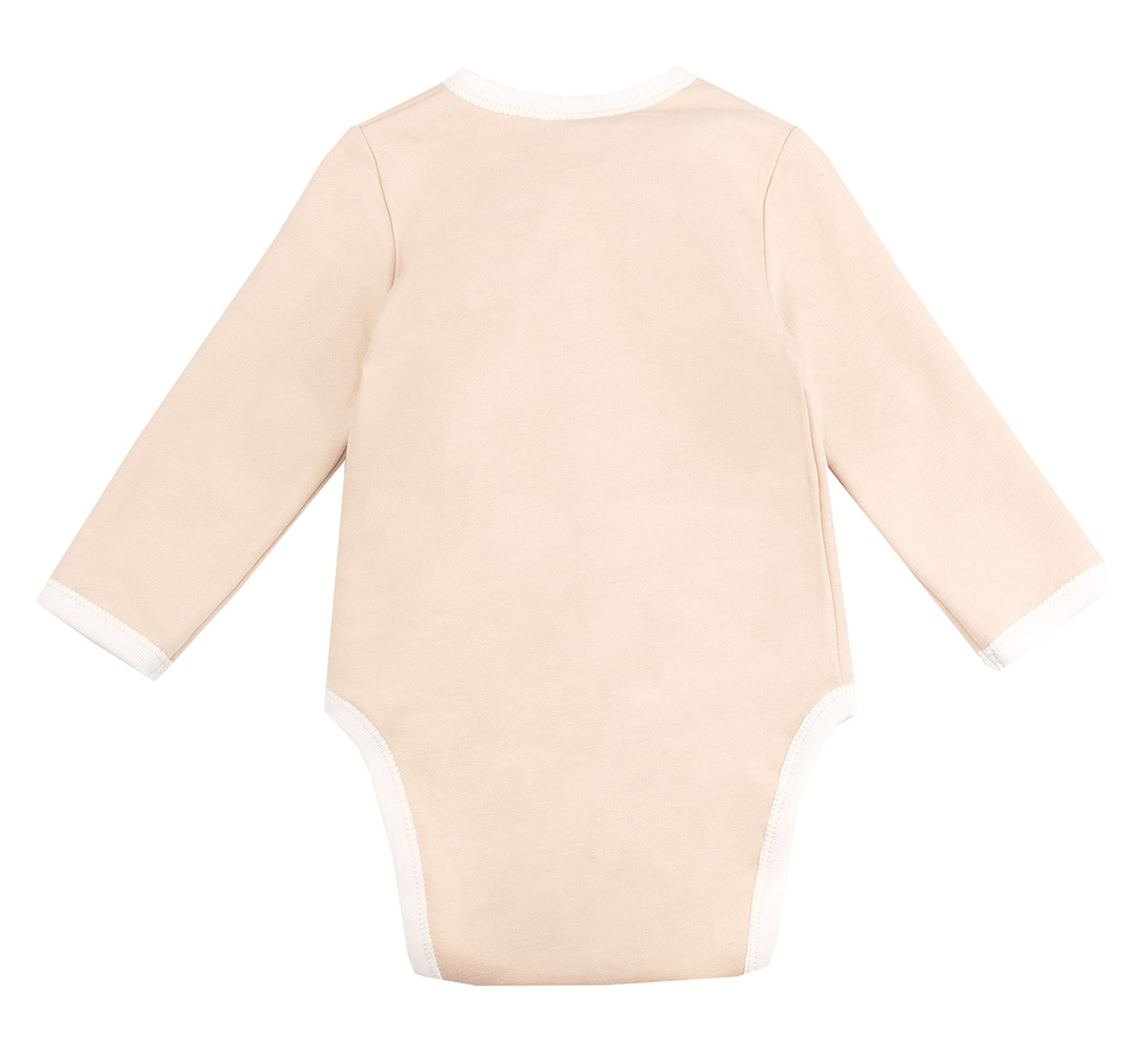 Байкове боді бежевого кольору, спереду на грудях симпатичний принт. Модель універсальна, підійде і для хлопчика, і для дівчинки. Боді з довгим рукавом, спинка і перед зі злитими кокетками. Боді застібається на кнопки спереду по всій планочці та між ніжками. Тканина м'яка і приємна на дотик, з начосом, подарує малюкові затишок і комфорт.